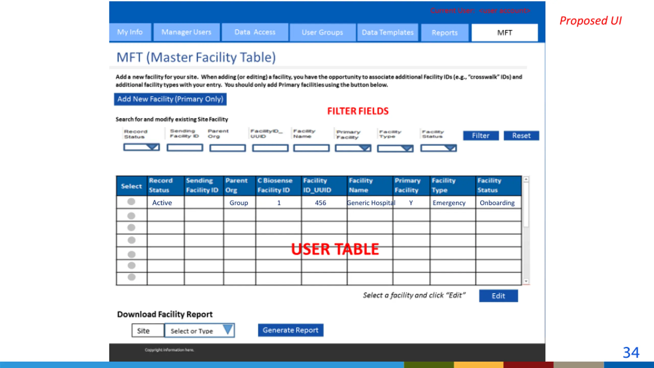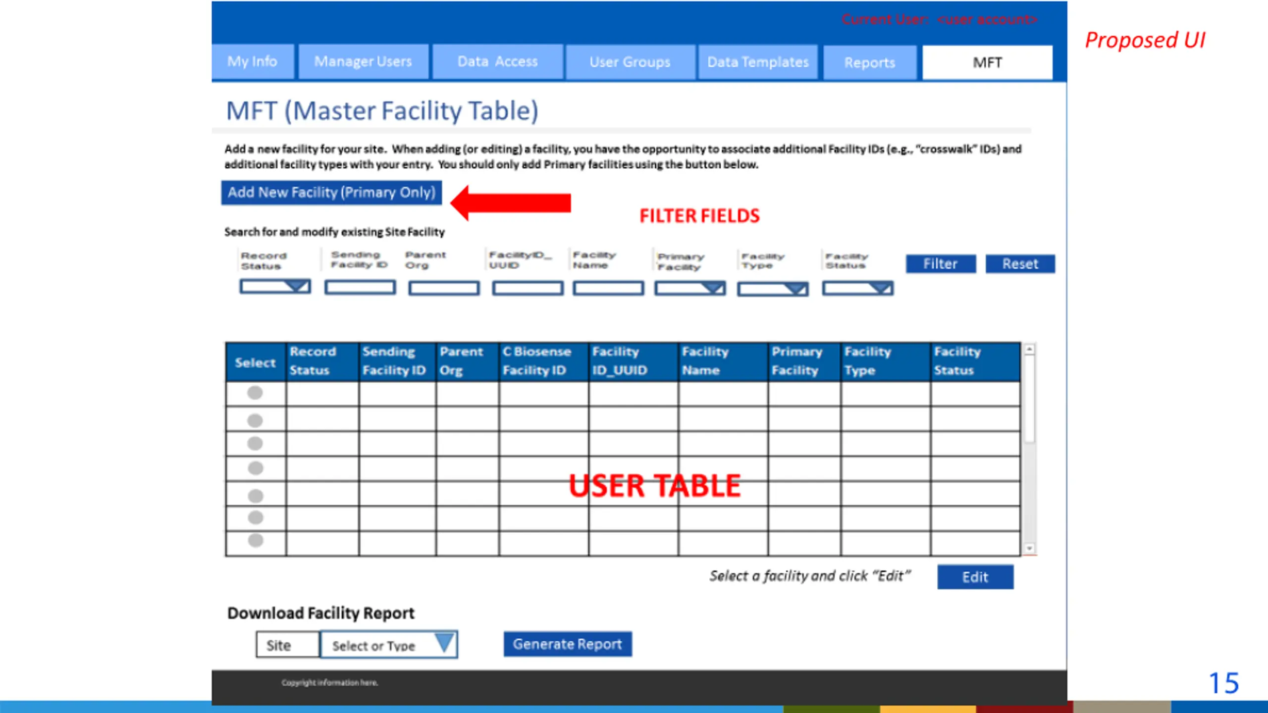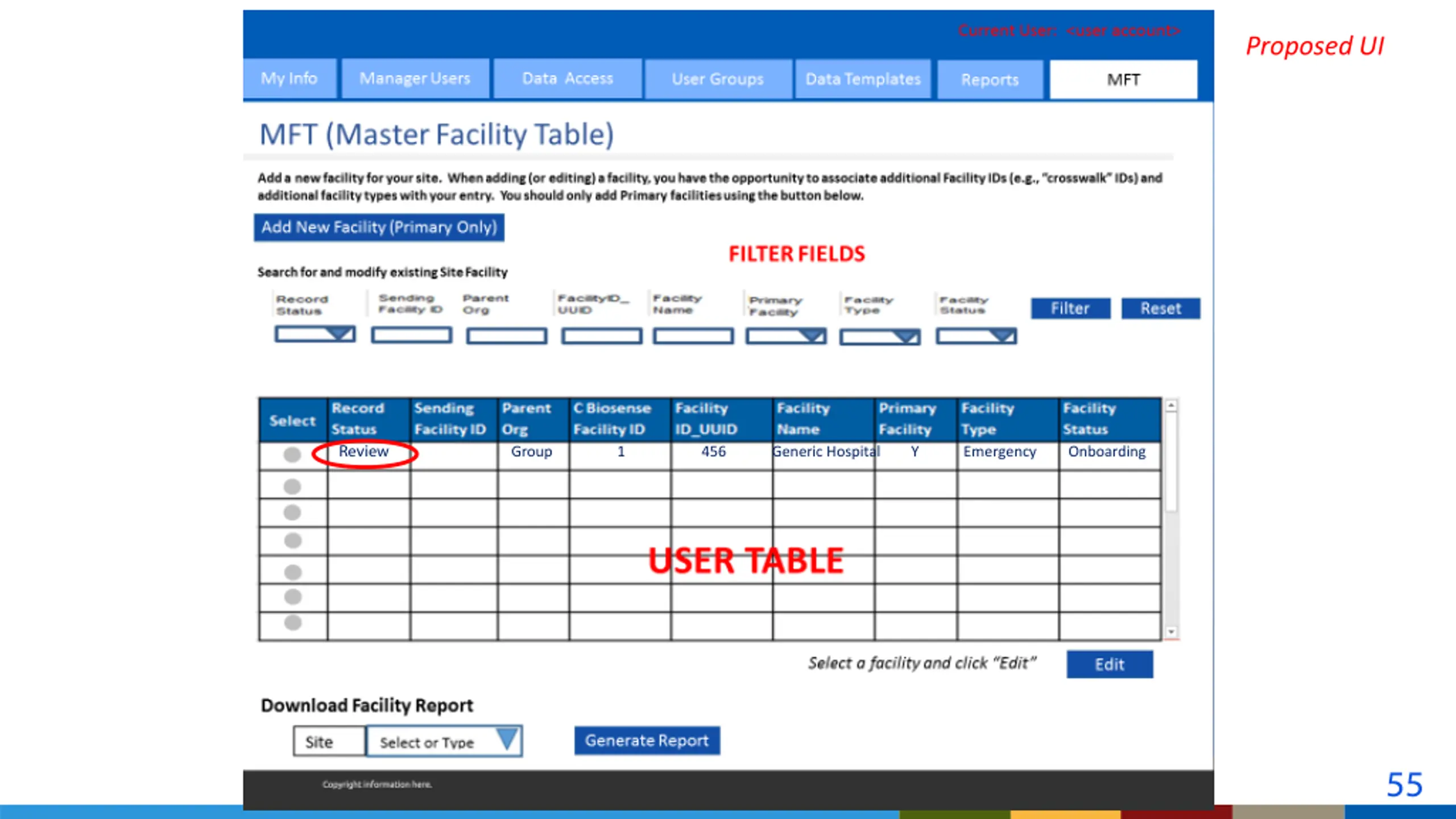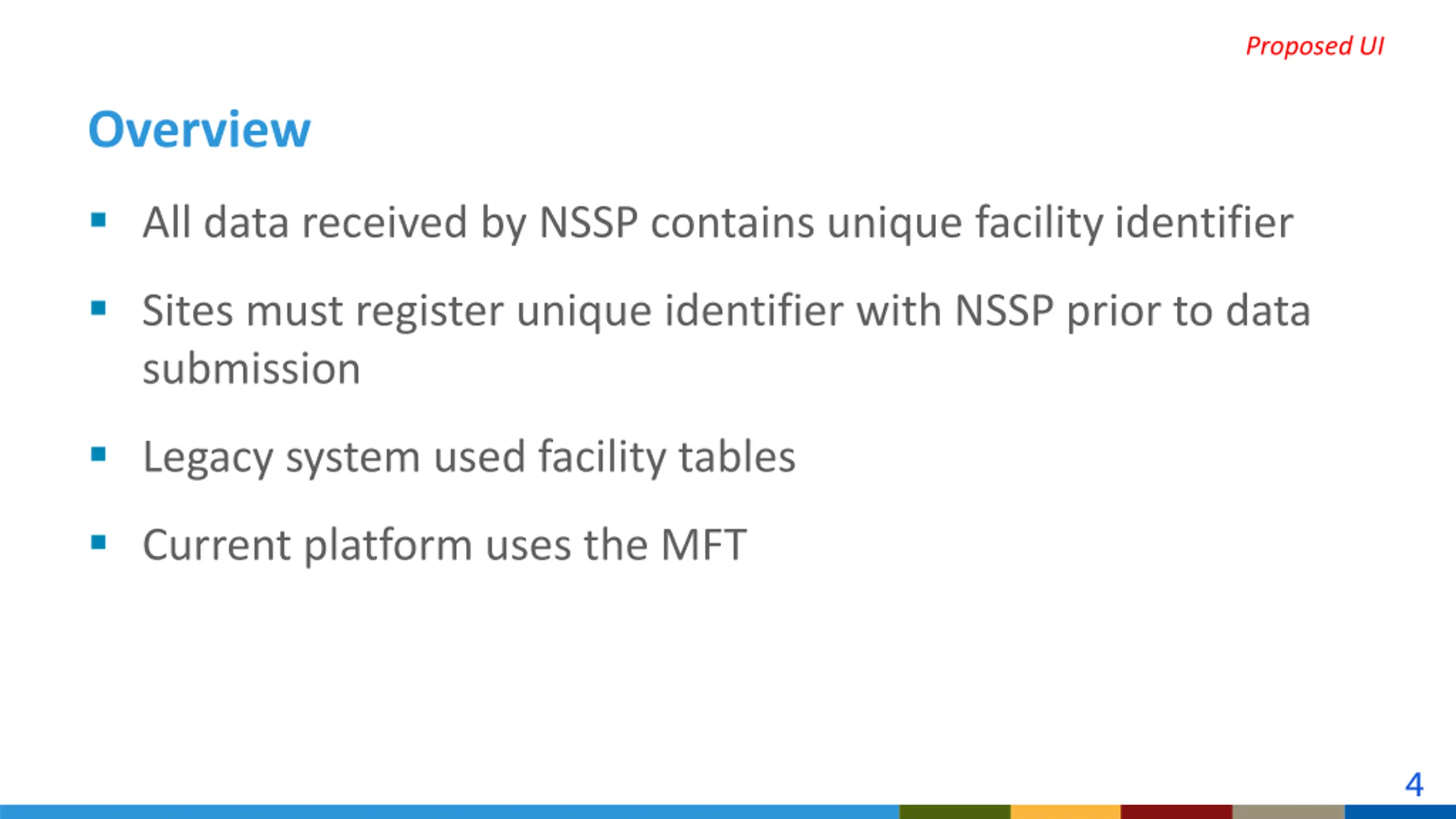 Proposed UI Overview All data received by NSSP contains unique facility identifier Sites must register unique identifier with NSSP prior to data submission Legacy system used facility tables Current platform uses the MFT 4