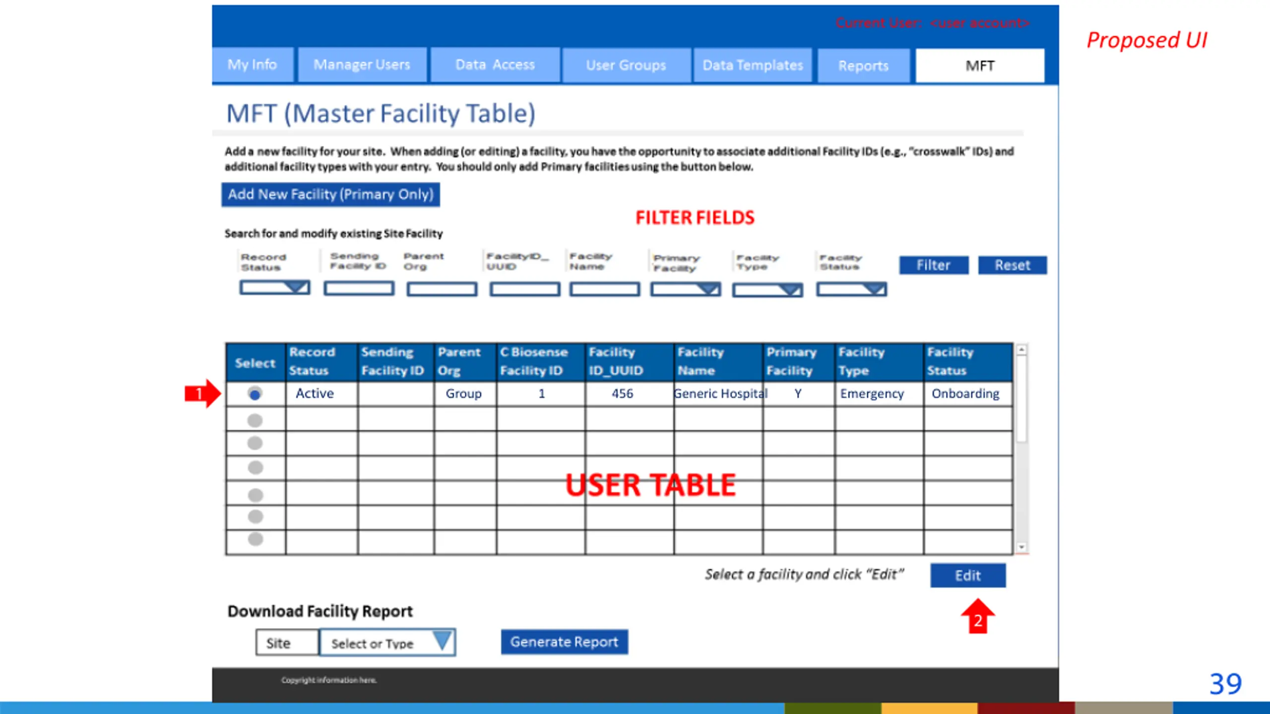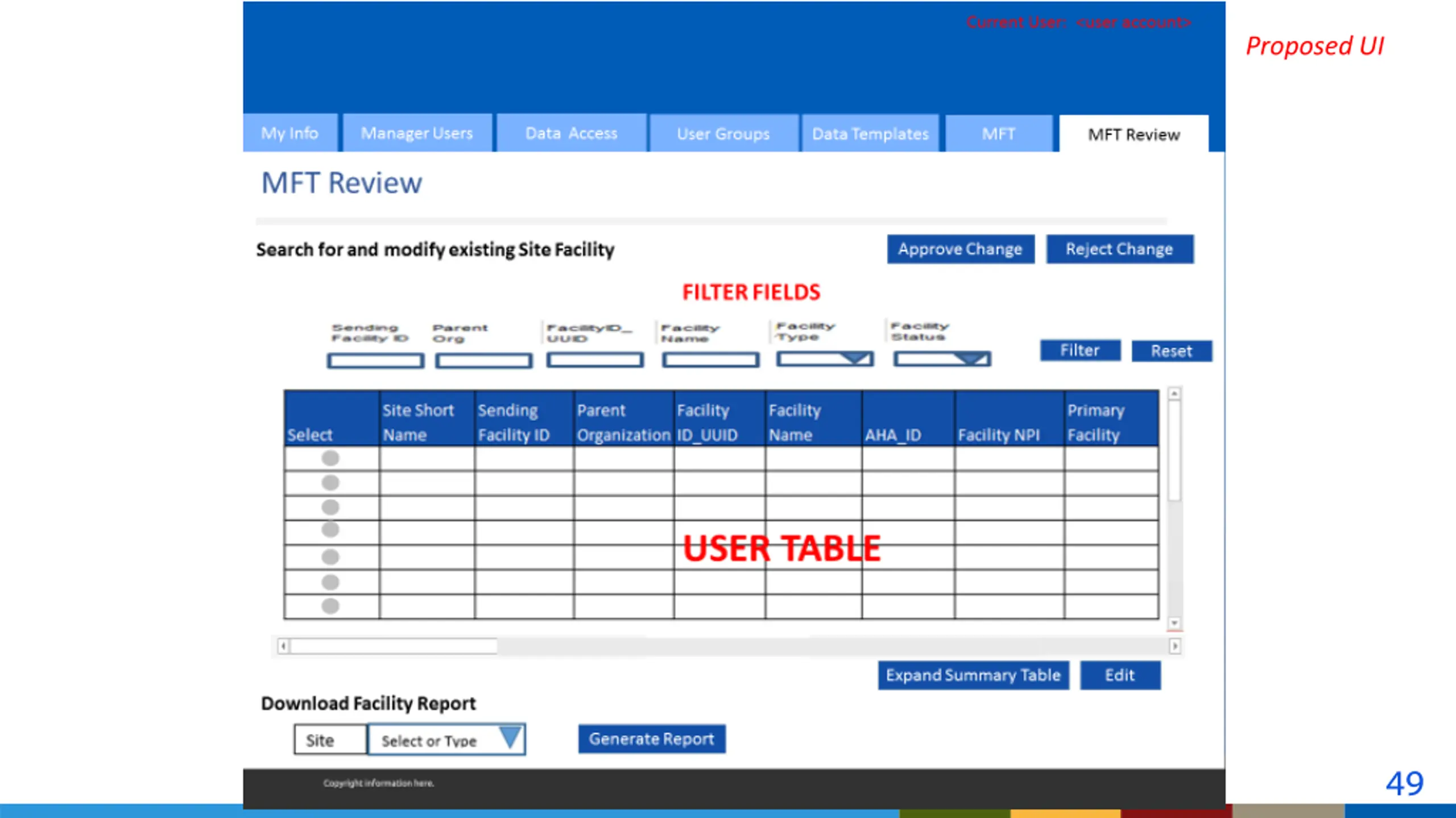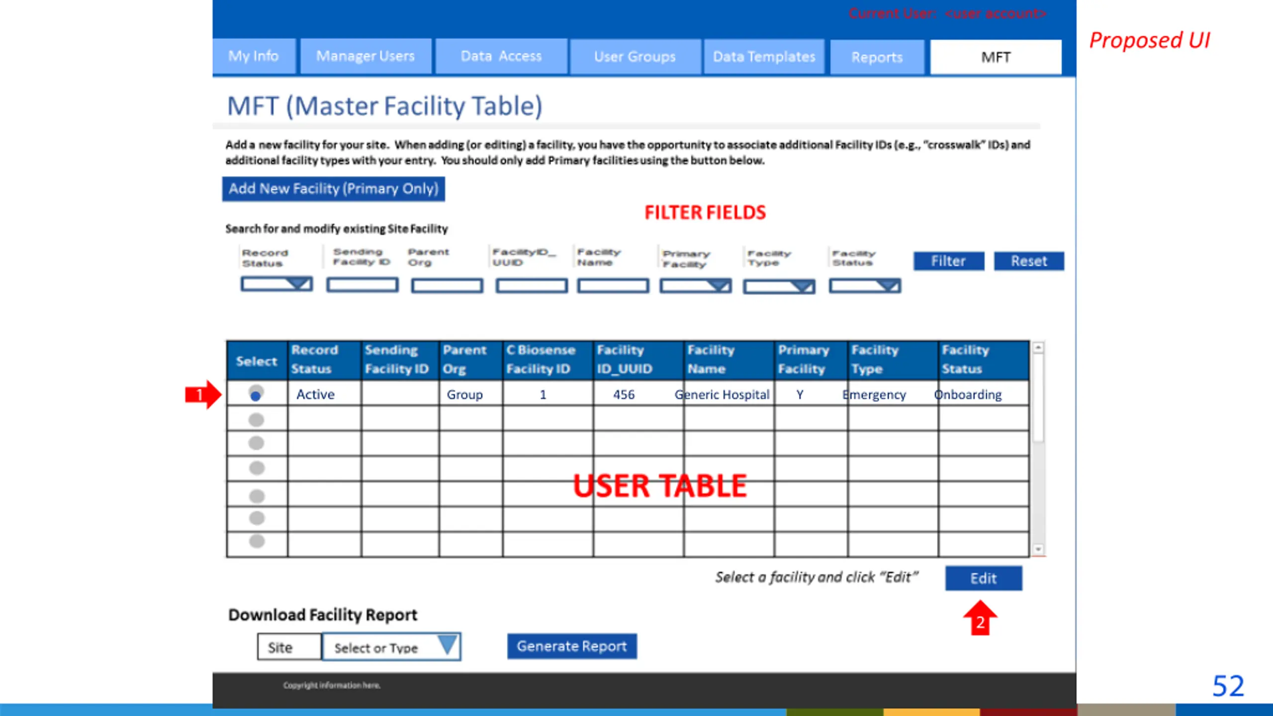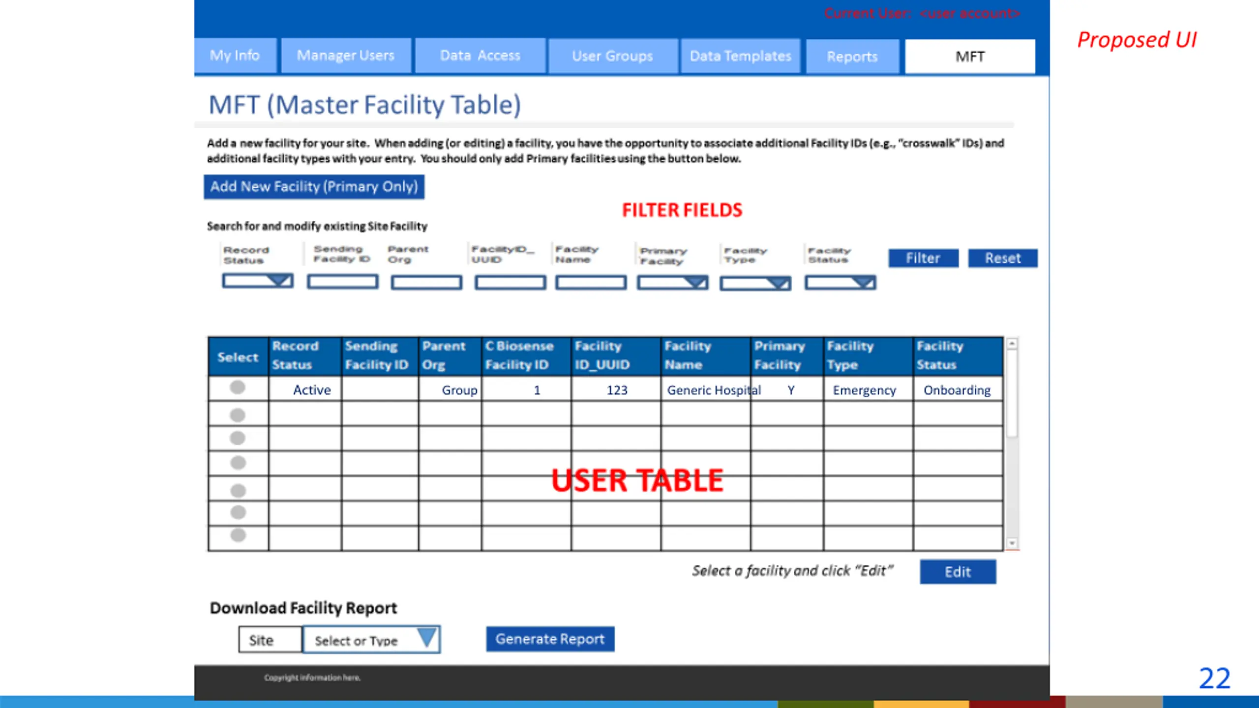 Proposed UI Overview All data received by NSSP contains unique facility identifier Sites must register unique identifier with NSSP prior to data submission Legacy system used facility tables Current platform uses the MFT 4