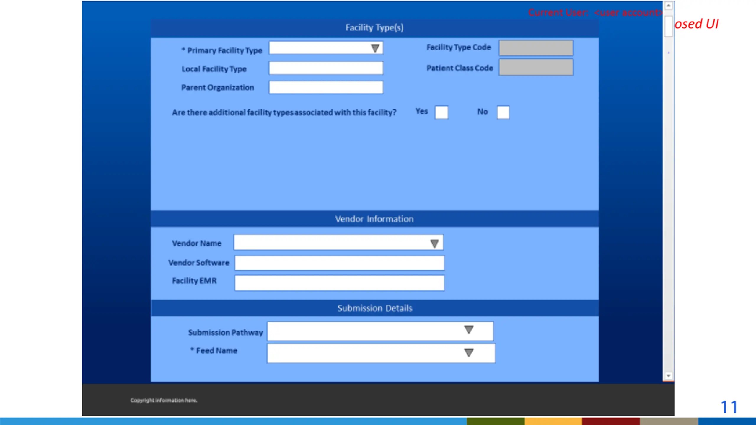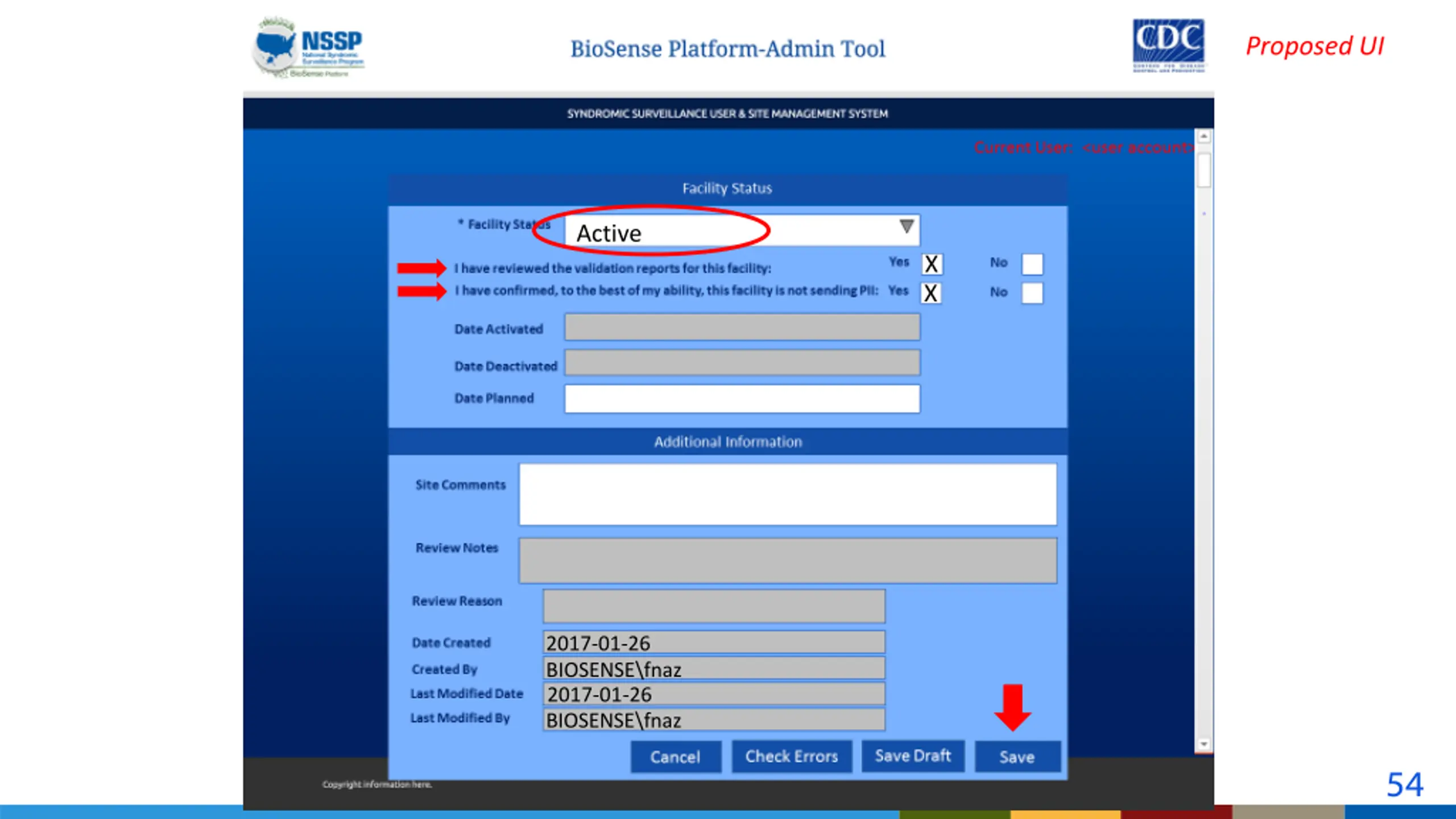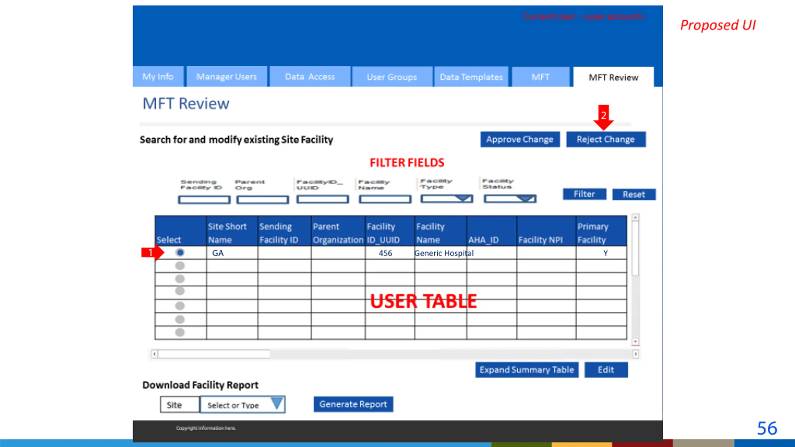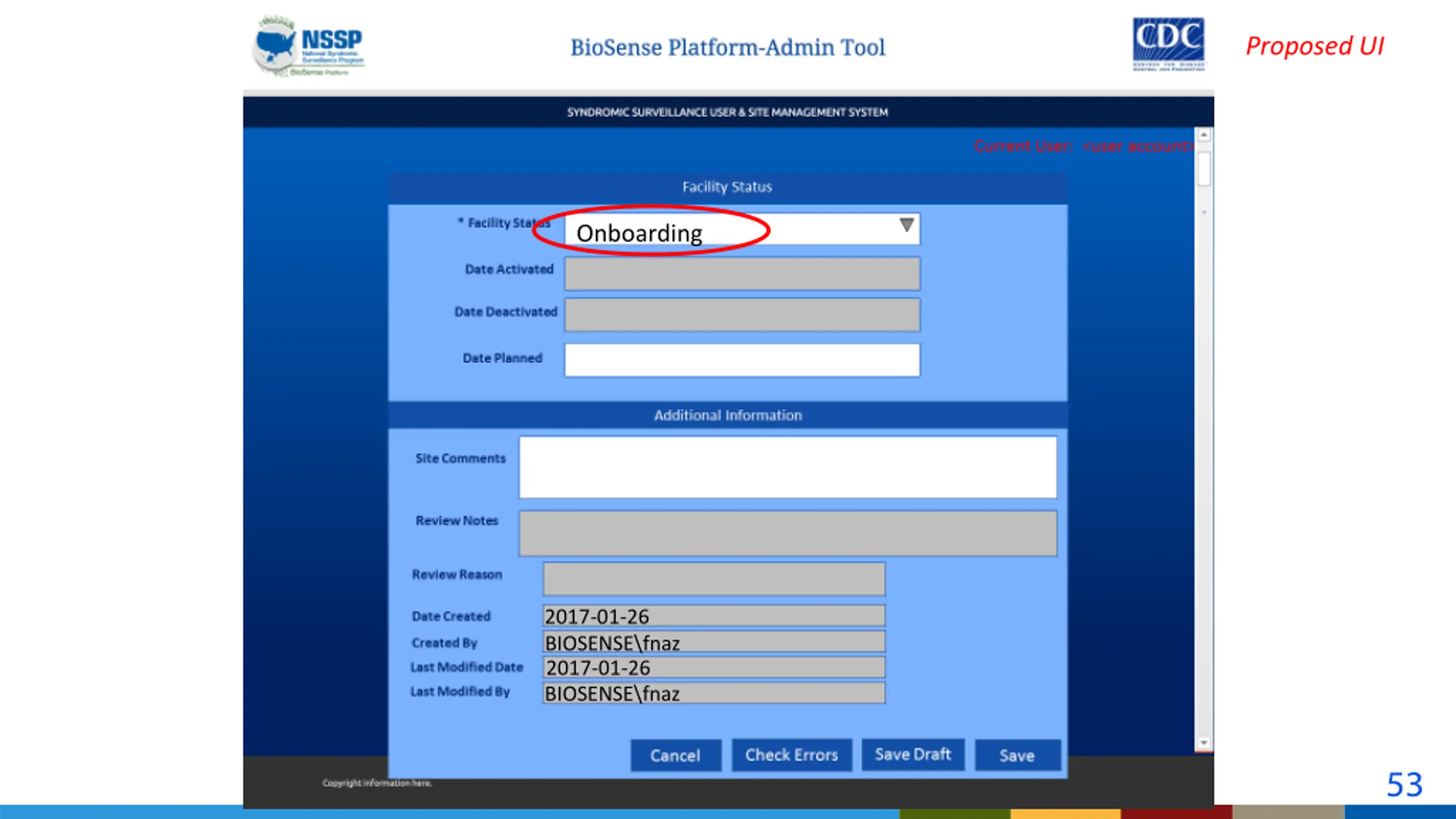 Proposed UI Overview All data received by NSSP contains unique facility identifier Sites must register unique identifier with NSSP prior to data submission Legacy system used facility tables Current platform uses the MFT 4
