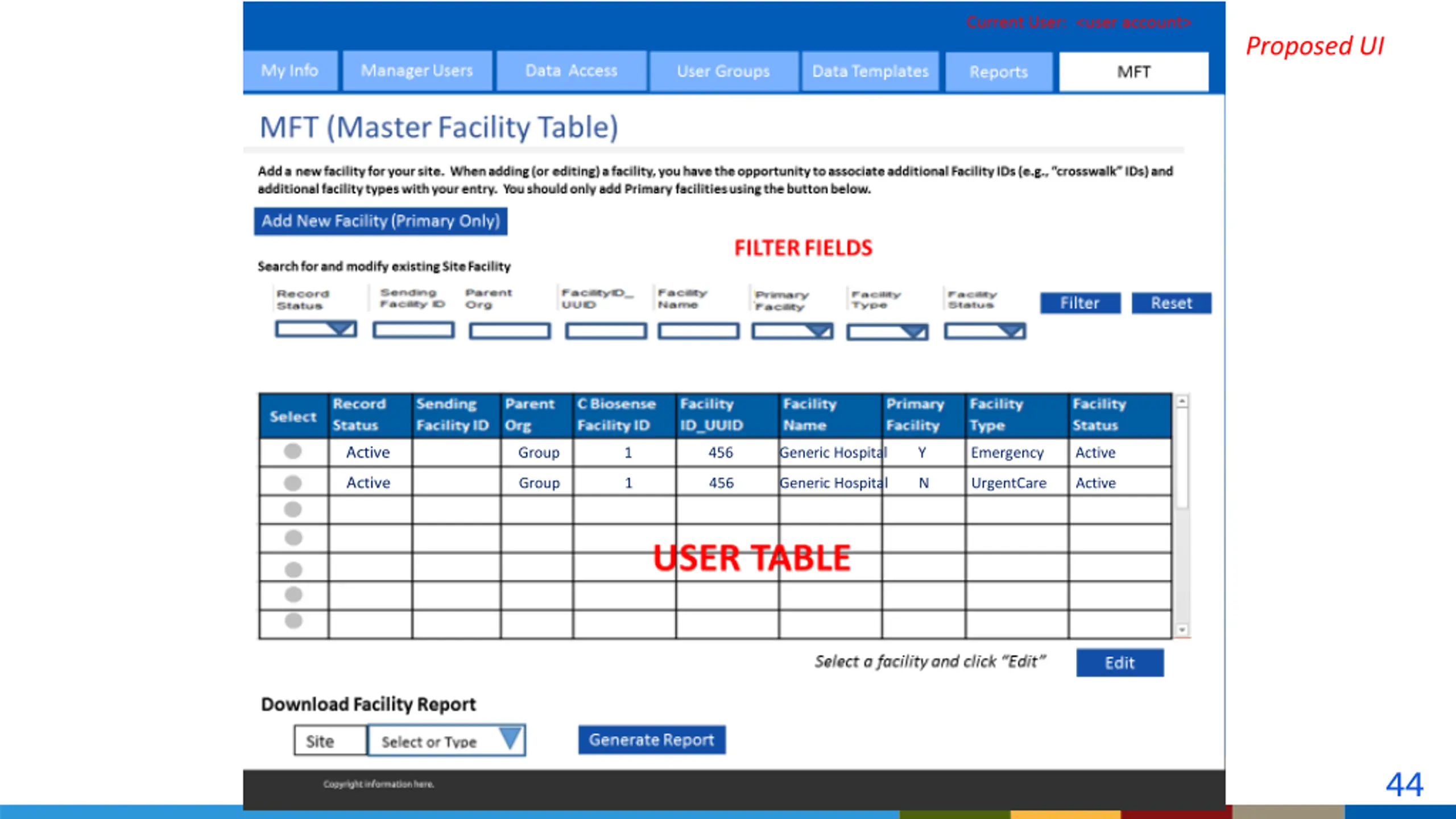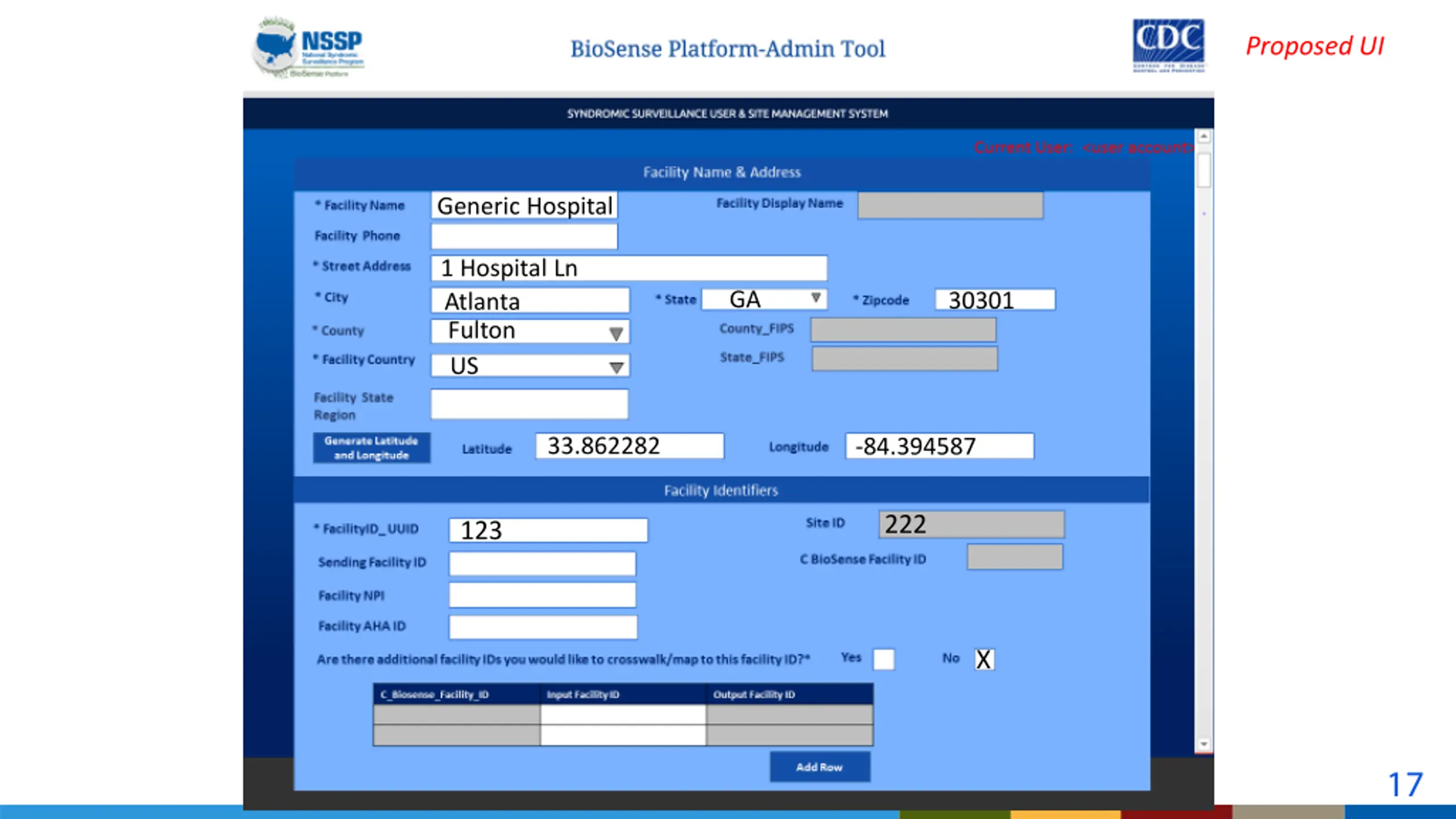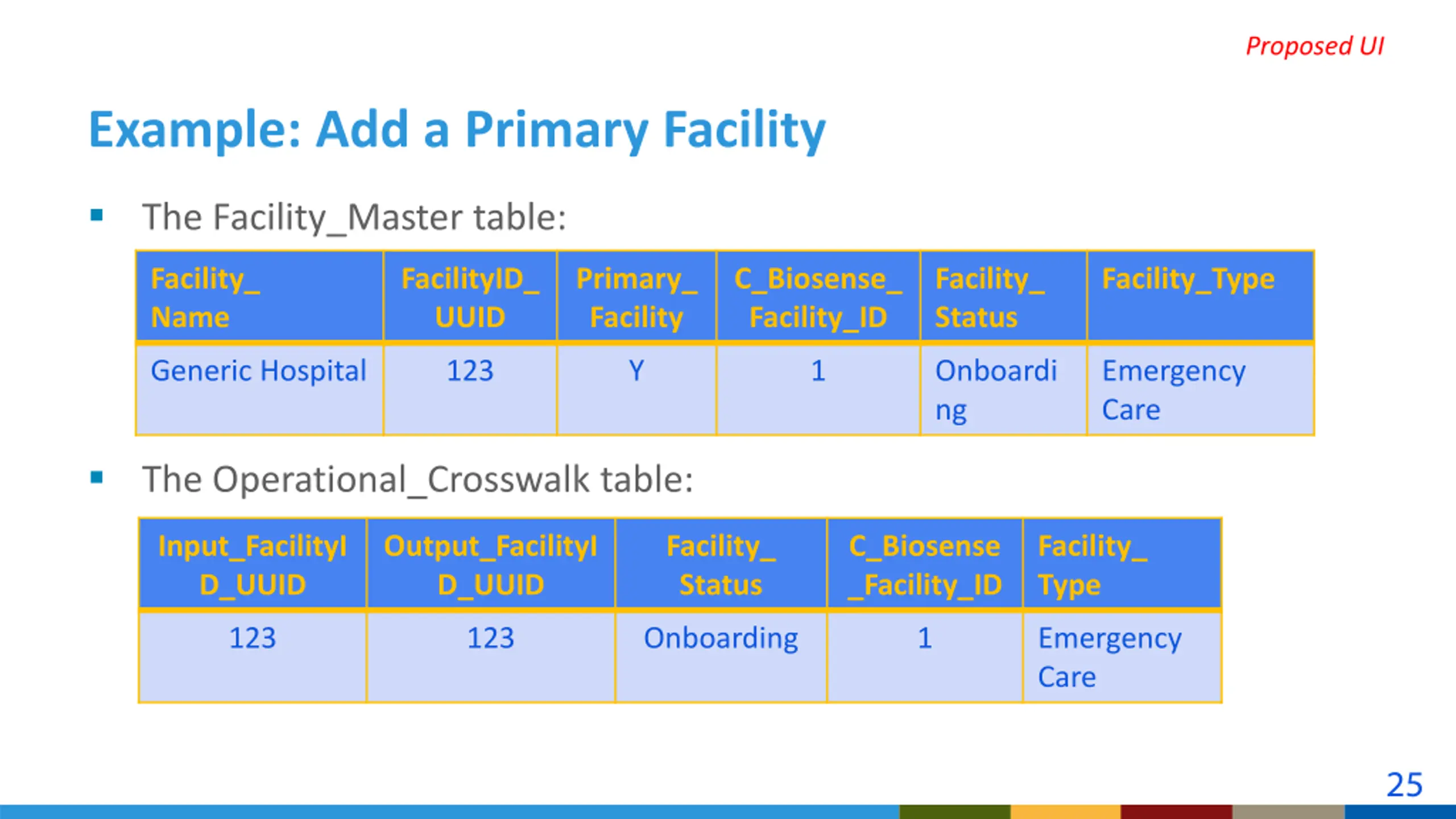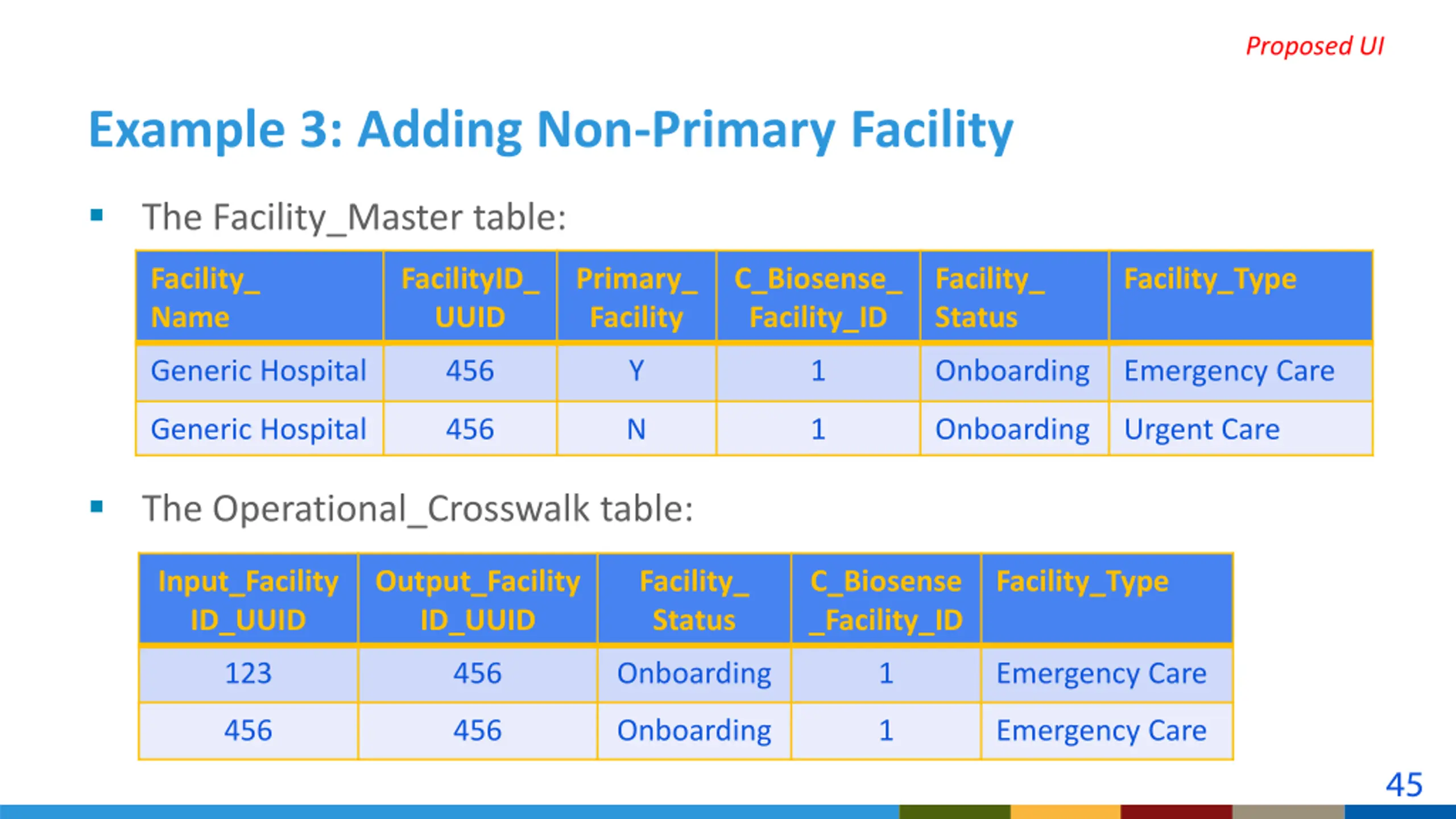 Proposed UI Example 3: Adding Non-Primary Facility The Facility_Master table: Facility_ Name FacilityID_ UUID Primary_ Facility C_Biosense_ Facility_ID Facility_ Status Facility_Type Generic Hospital 456 Y 1 Onboarding Emergency Care Generic Hospital 456 N 1 Onboarding Urgent Care The Operational_Crosswalk table: Input_Facility ID_UUID Output_Facility ID_UUID Facility_ Status C_Biosense _Facility_ID Facility_Type 123 456 Onboarding 1 Emergency Care 456 456 Onboarding 1 Emergency Care 45