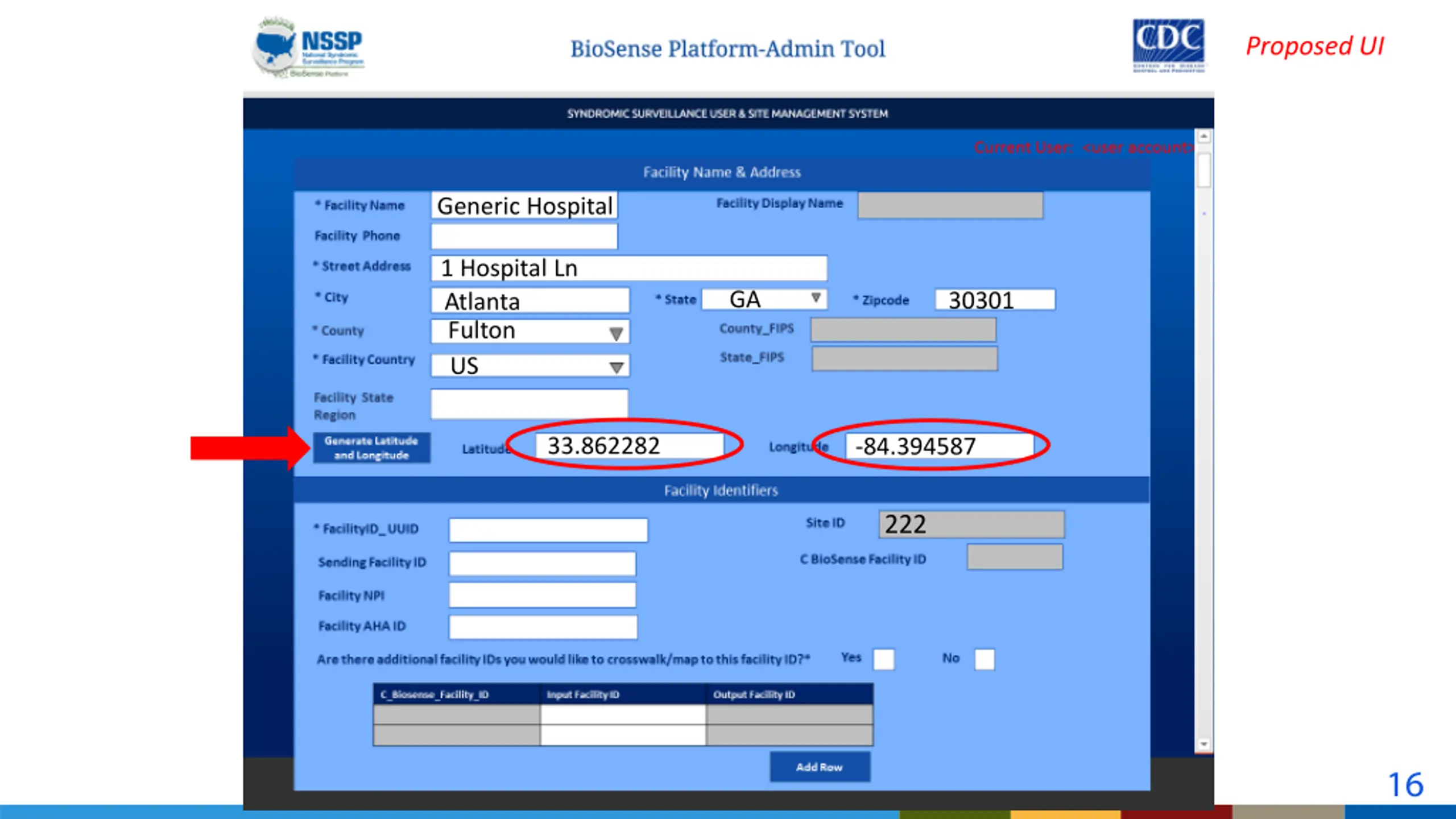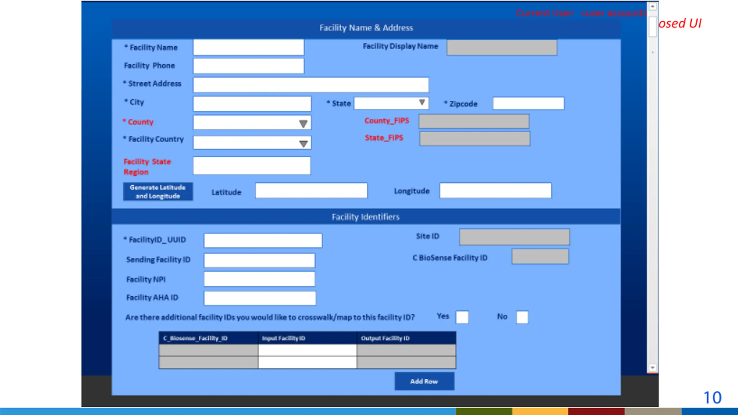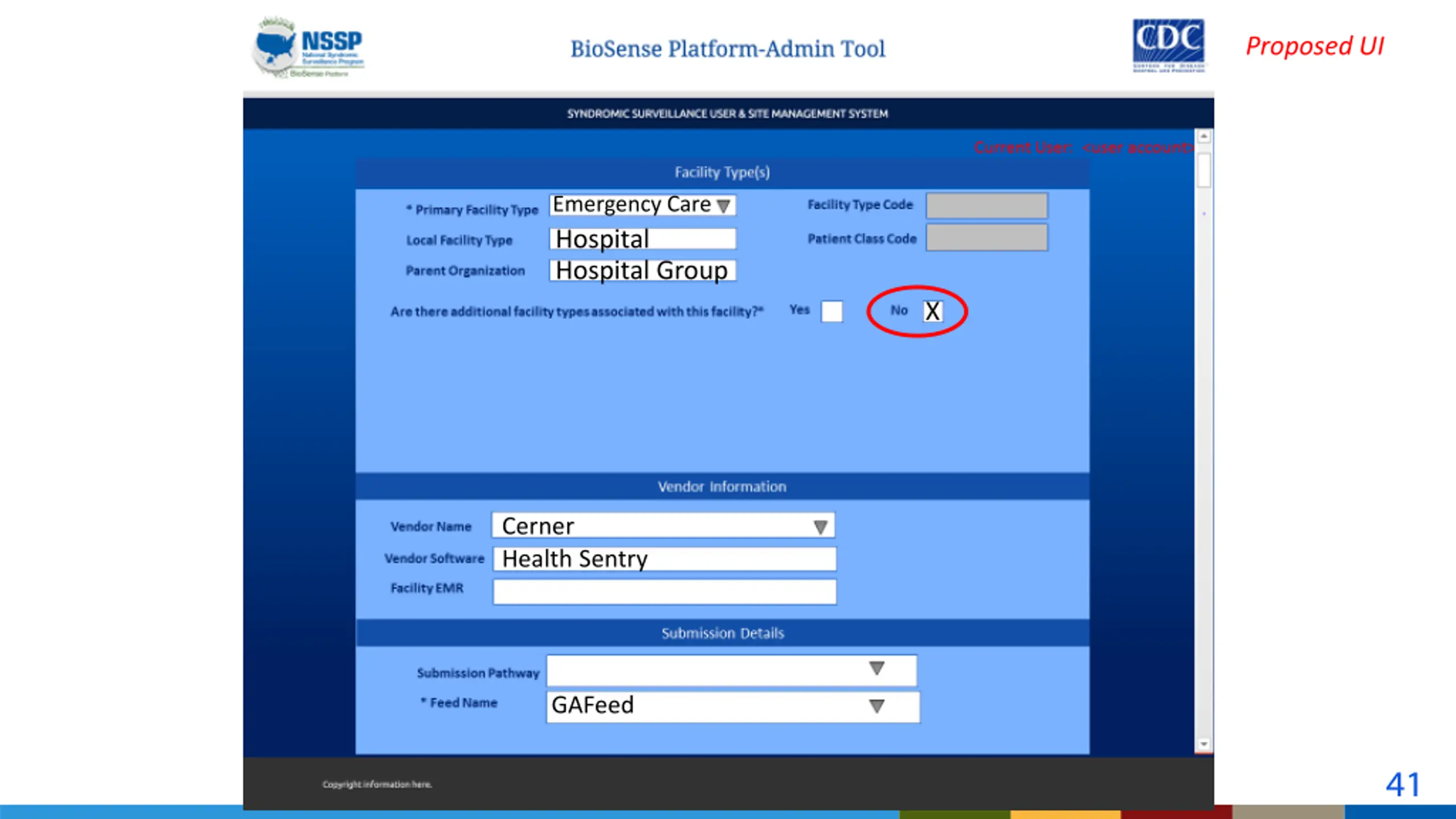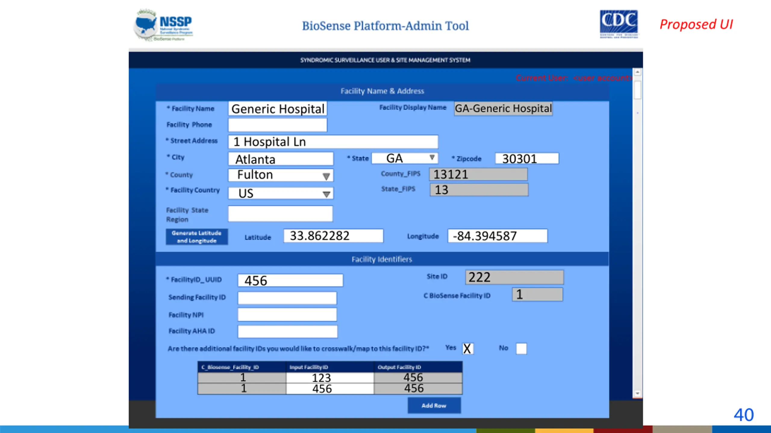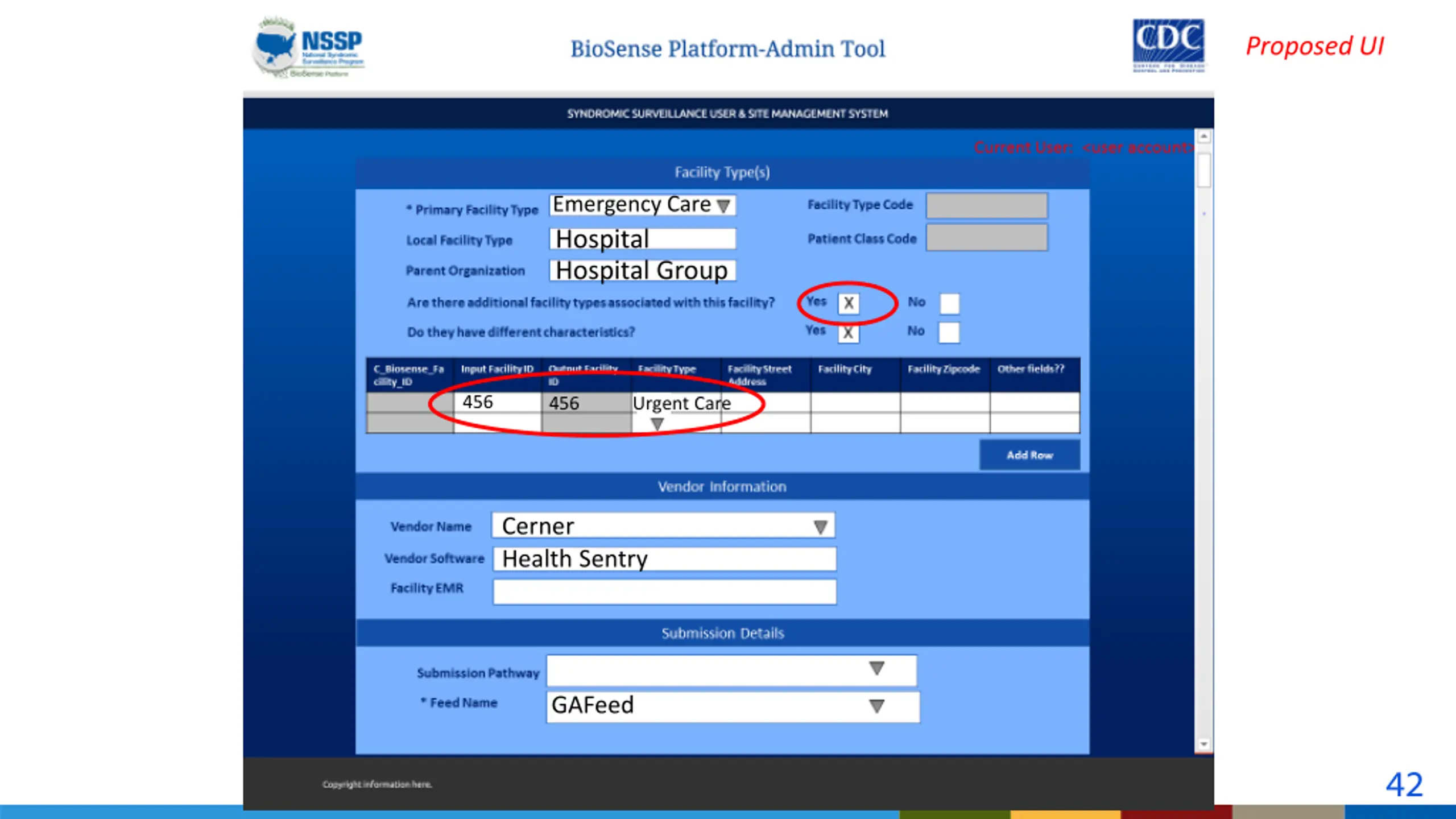 Proposed UI Example 3: Adding Non-Primary Facility The Facility_Master table: Facility_ Name FacilityID_ UUID Primary_ Facility C_Biosense_ Facility_ID Facility_ Status Facility_Type Generic Hospital 456 Y 1 Onboarding Emergency Care Generic Hospital 456 N 1 Onboarding Urgent Care The Operational_Crosswalk table: Input_Facility ID_UUID Output_Facility ID_UUID Facility_ Status C_Biosense _Facility_ID Facility_Type 123 456 Onboarding 1 Emergency Care 456 456 Onboarding 1 Emergency Care 45