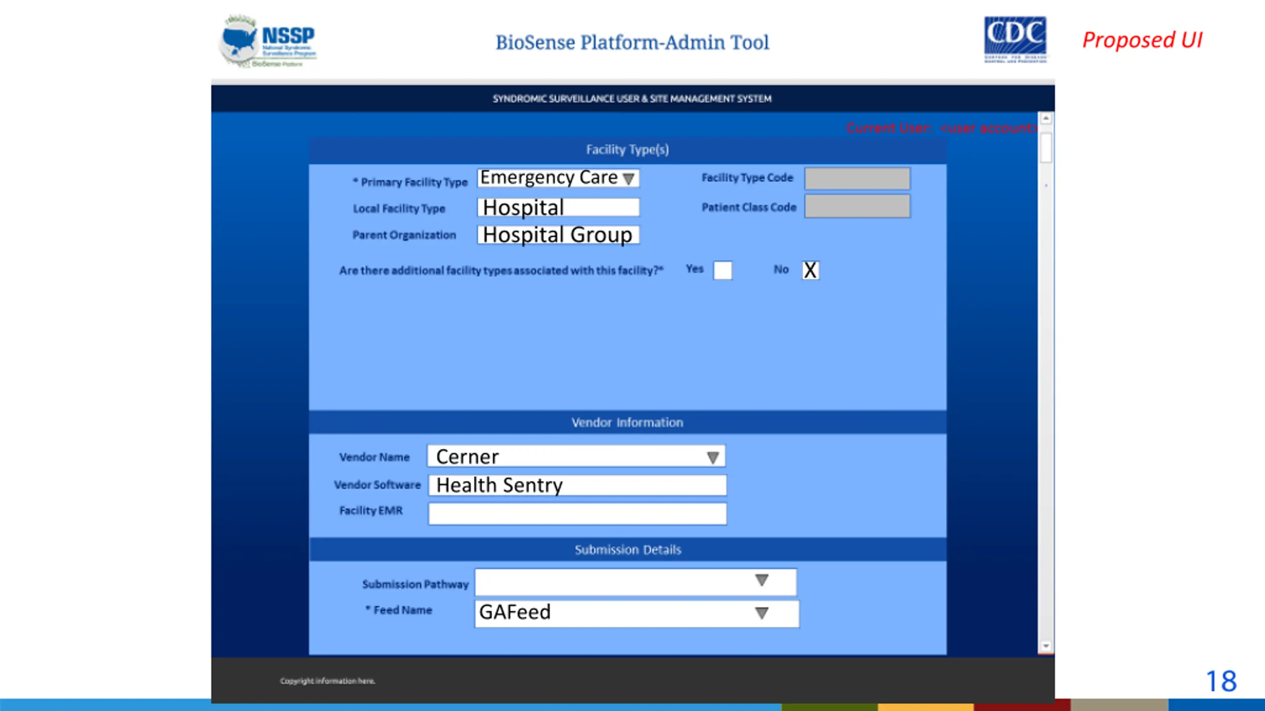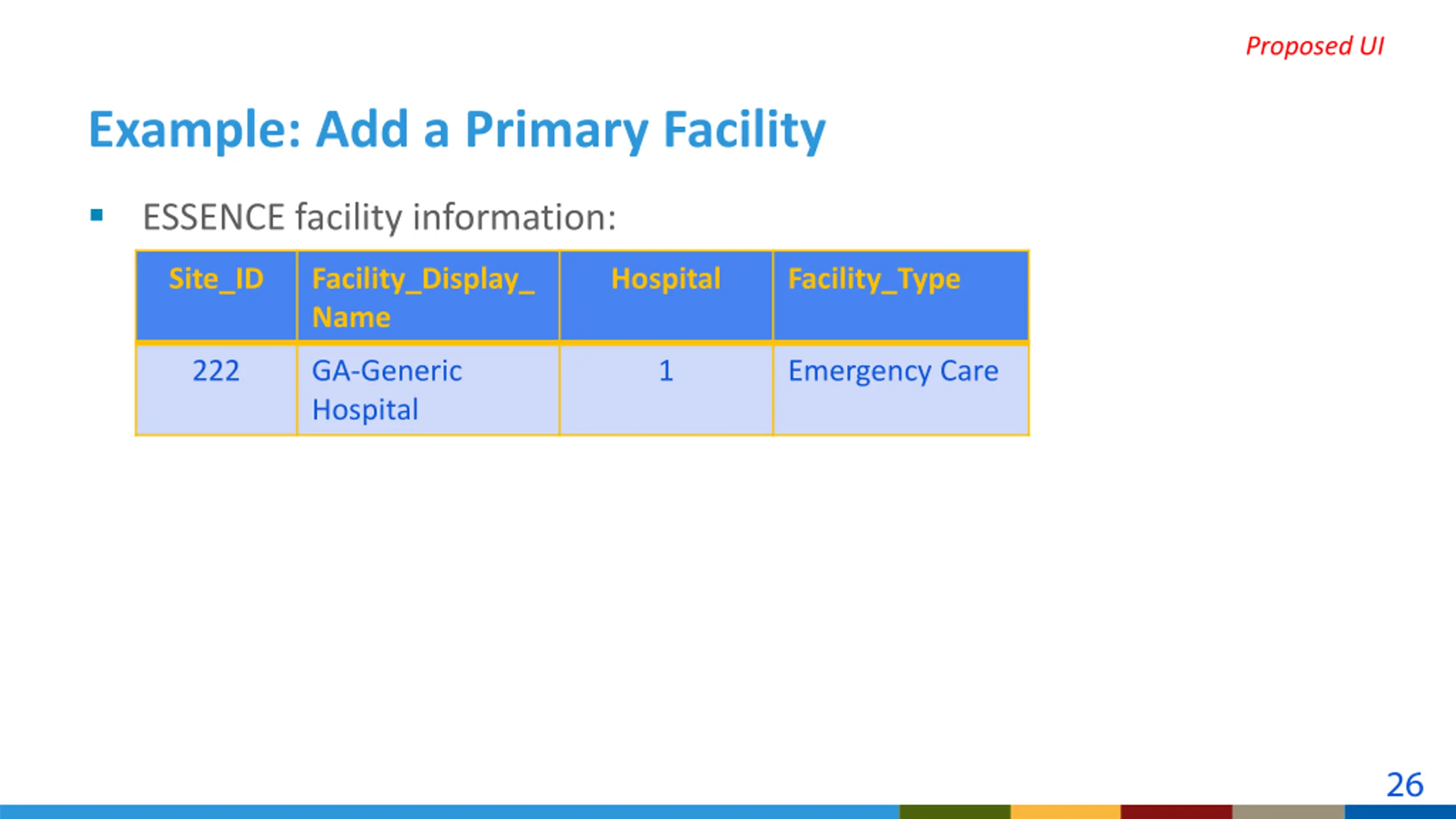 Proposed UI Example: Add a Primary Facility ESSENCE facility information: Site_ID Facility_Display_ Name Hospital Facility_Type 222 GA-Generic Hospital 1 Emergency Care 26