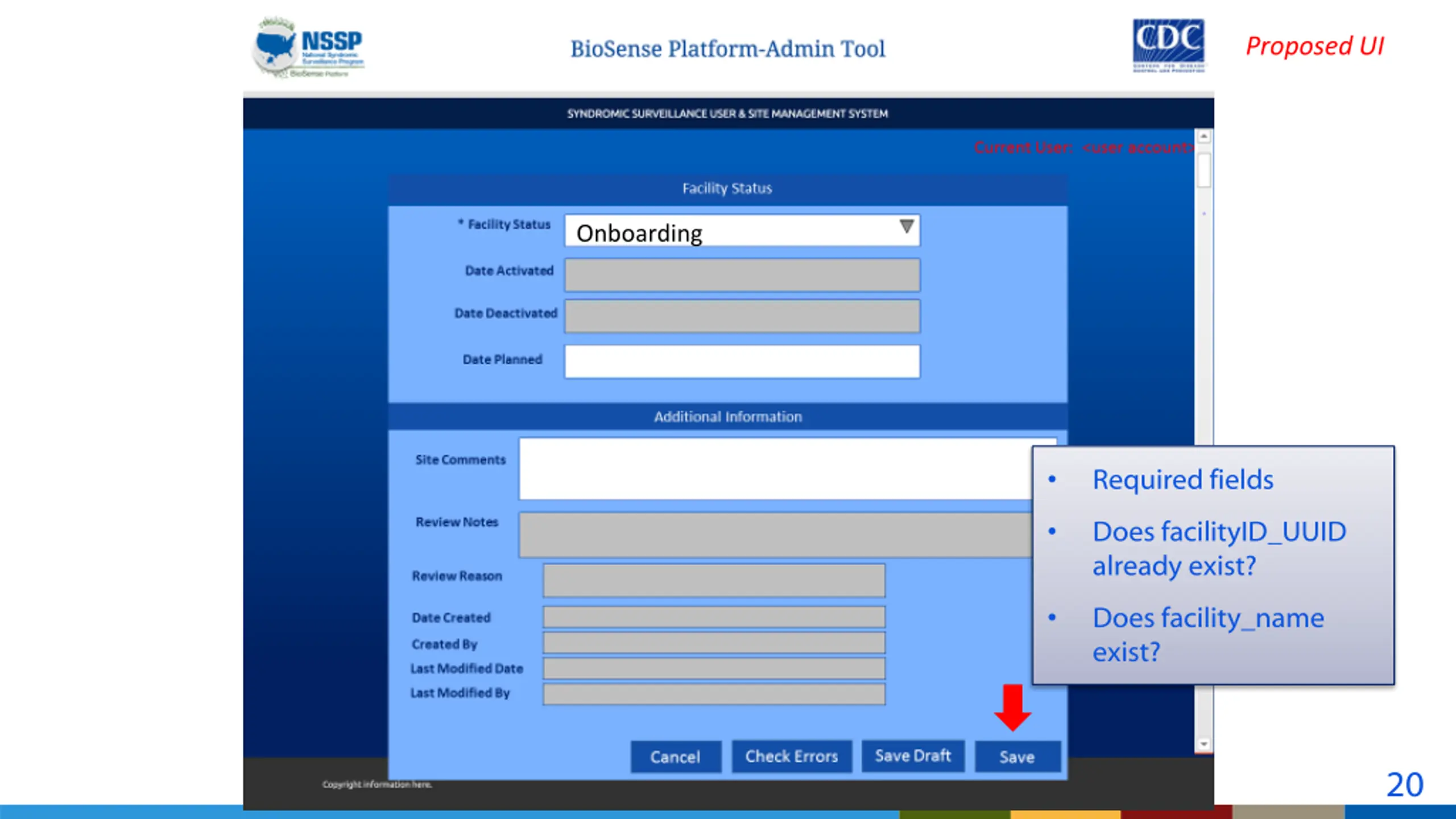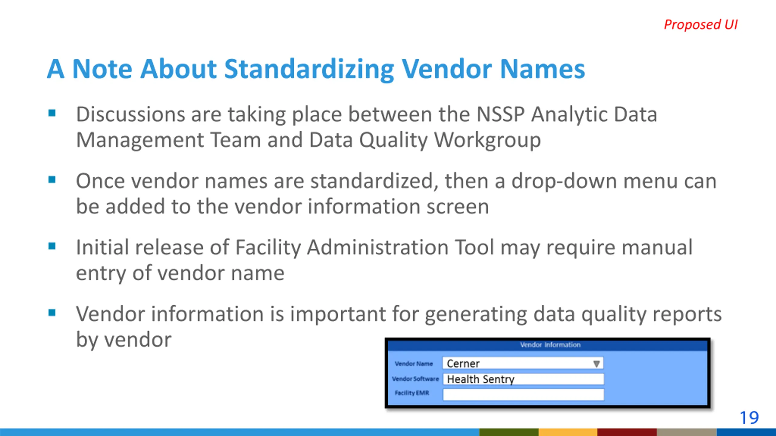 Proposed UI A Note About Standardizing Vendor Names Discussions are taking place between the NSSP Analytic Data Management Team and Data Quality Workgroup Once vendor names are standardized, then a drop-down menu can be added to the vendor information screen Initial release of Facility Administration Tool may require manual entry of vendor name Vendor information is important for generating data quality reports by vendor 19