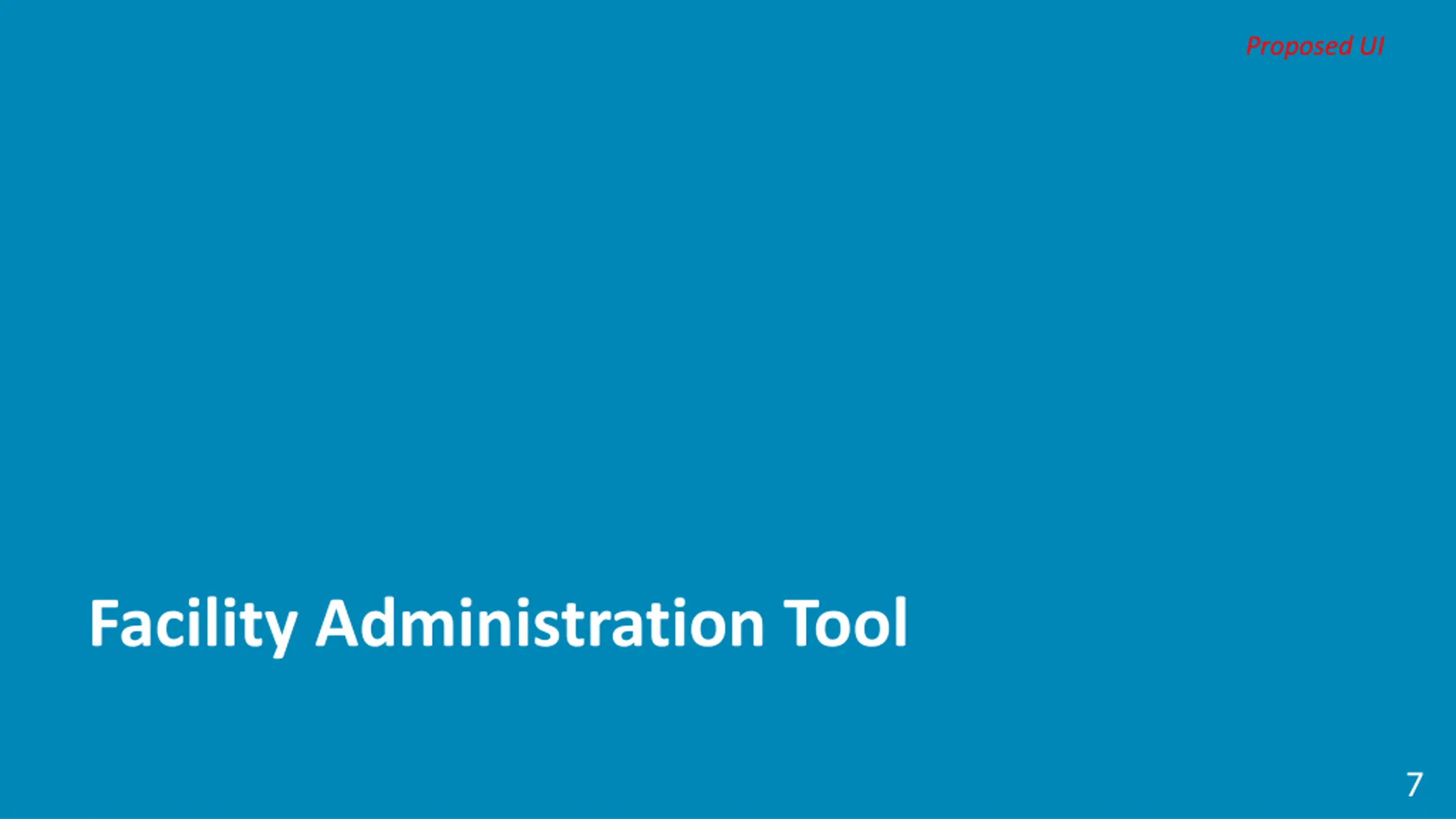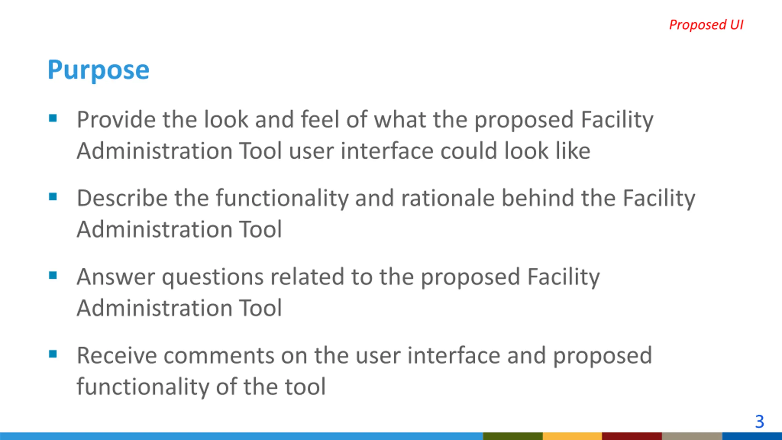 Proposed UI Purpose Provide the look and feel of what the proposed Facility Administration Tool user interface could look like Describe the functionality and rationale behind the Facility Administration Tool Answer questions related to the proposed Facility Administration Tool Receive comments on the user interface and proposed functionality of the tool 3