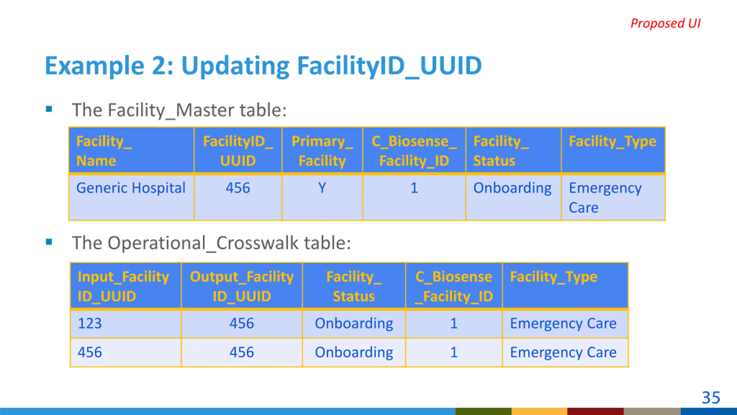 Proposed UI Example 2: Updating FacilityID_UUID The Facility_Master table: Facility_ Name FacilityID_ UUID Primary_ Facility C_Biosense_ Facility_ID Facility_ Status Facility_Type Generic Hospital 456 Y 1 Onboarding Emergency Care The Operational_Crosswalk table: Input_Facility ID_UUID Output_Facility ID_UUID Facility_ Status C_Biosense _Facility_ID Facility_Type 123 456 Onboarding 1 Emergency Care 456 456 Onboarding 1 Emergency Care 35