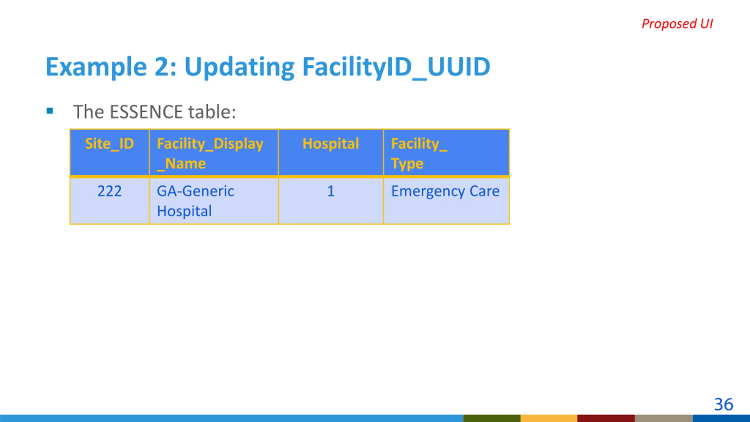 Proposed UI Example 2: Updating FacilityID_UUID The ESSENCE table: Site_ID Facility_Display _Name Hospital Facility_ Type 222 GA-Generic Hospital 1 Emergency Care 36