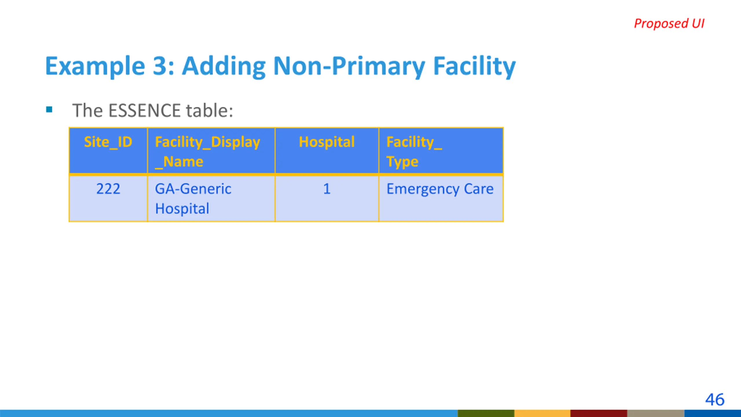 Proposed UI Example 3: Adding Non-Primary Facility The ESSENCE table: Site_ID Facility_Display _Name Hospital Facility_ Type 222 GA-Generic Hospital 1 Emergency Care 46