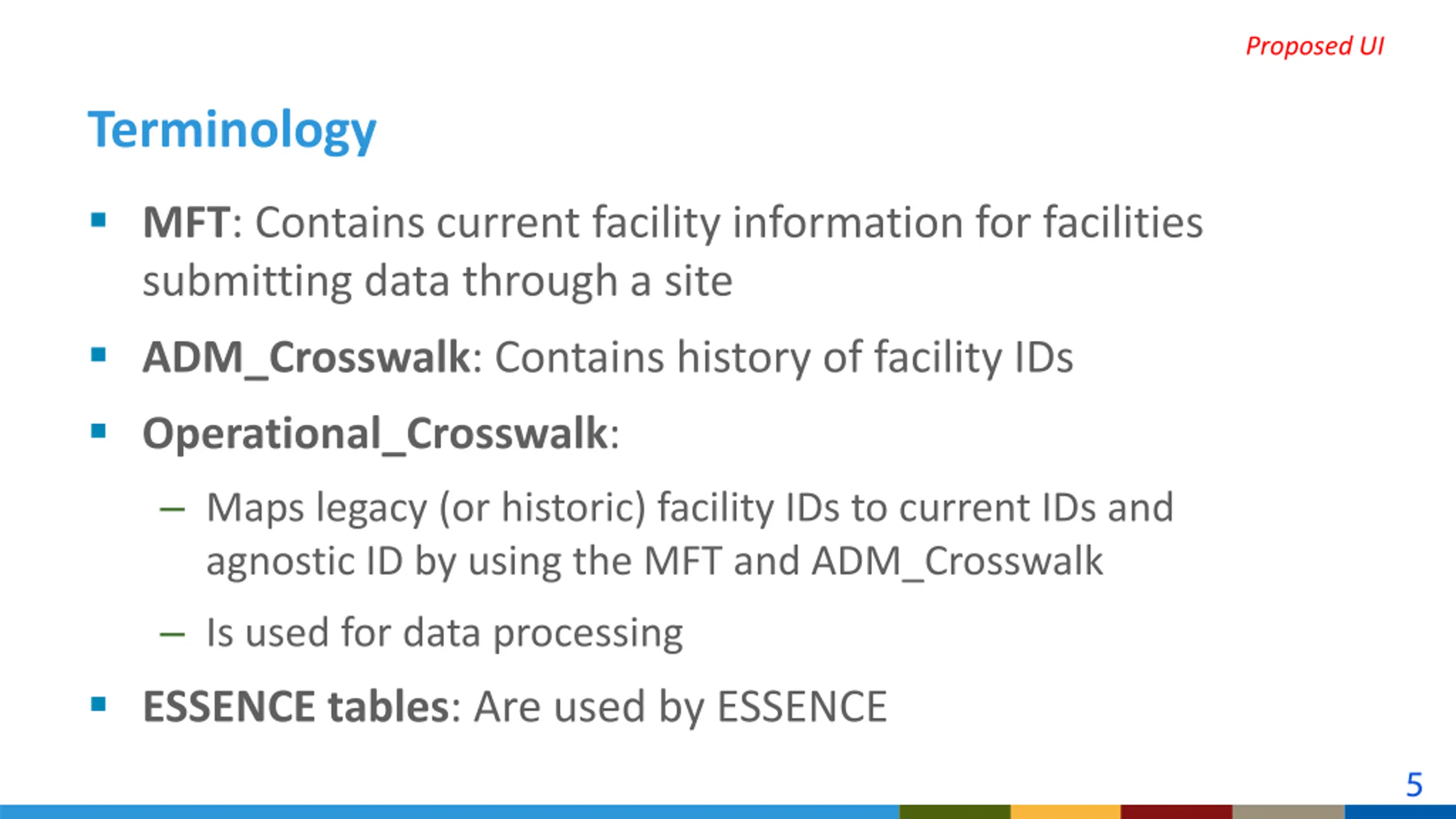 Proposed UI Terminology MFT: Contains current facility information for facilities submitting data through a site ADM_Crosswalk: Contains history of facility IDs Operational_Crosswalk: Maps legacy (or historic) facility IDs to current IDs and agnostic ID by using the MFT and ADM_Crosswalk Is used for data processing ESSENCE tables: Are used by ESSENCE 5