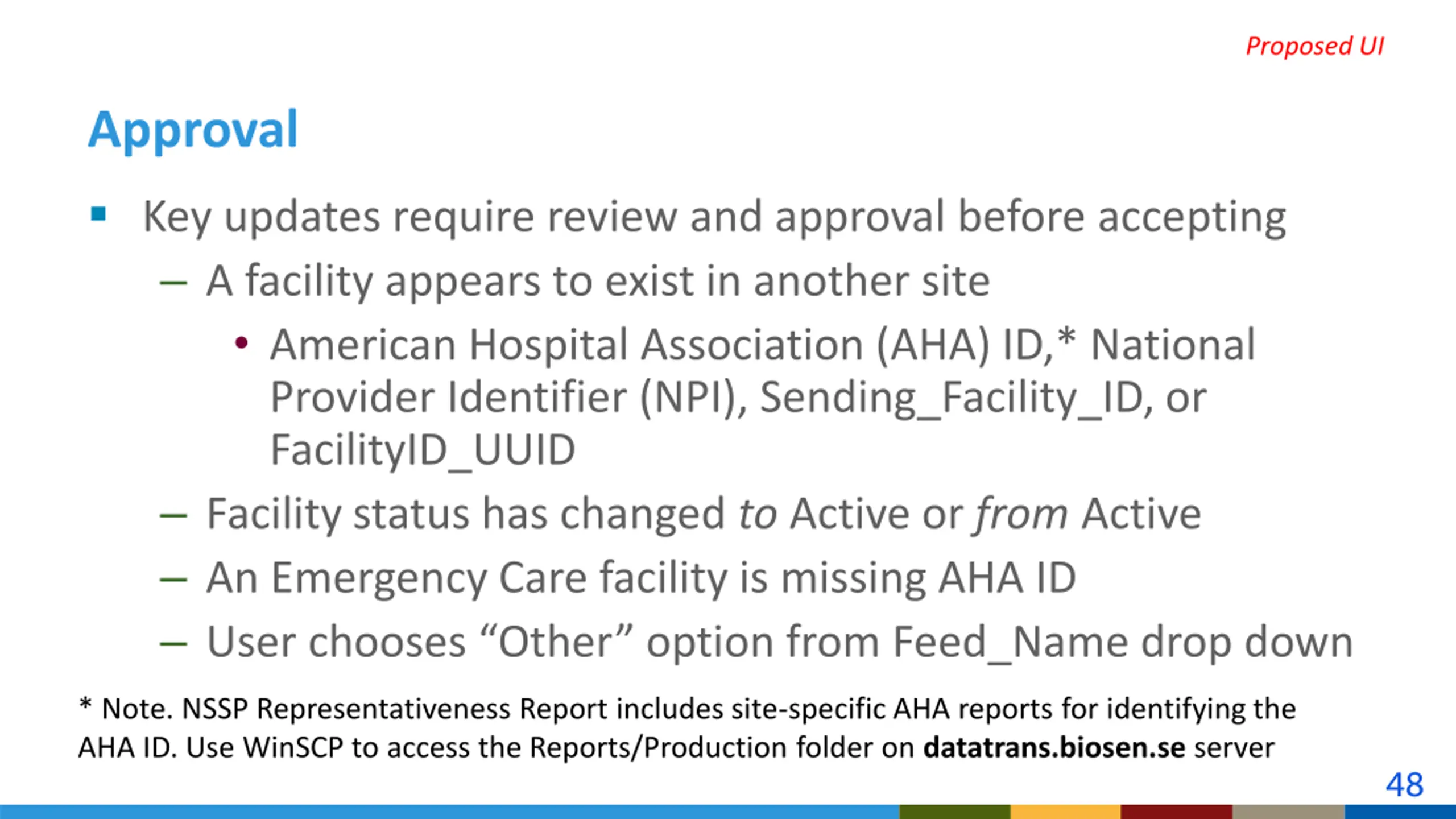 Proposed UI Approval Key updates require review and approval before accepting A facility appears to exist in another site American Hospital Association (AHA) ID,* National Provider Identifier (NPI), Sending_Facility_ID, or FacilityID_UUID Facility status has changed to Active or from Active An Emergency Care facility is missing AHA ID User chooses Other option from Feed_Name drop down * Note. NSSP Representativeness Report includes site-specific AHA reports for identifying the AHA ID. Use WinSCP to access the Reports/Production folder on datatrans.biosen.se server 48