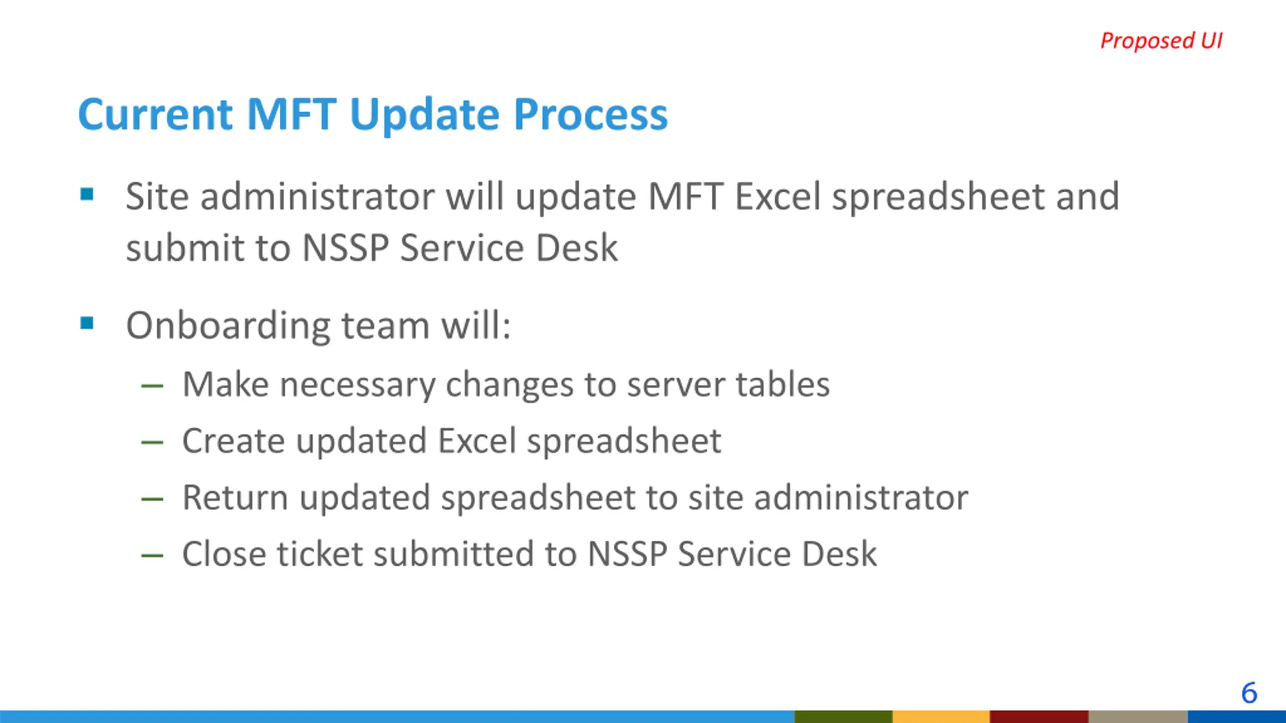 Proposed UI Current MFT Update Process Site administrator will update MFT Excel spreadsheet and submit to NSSP Service Desk Onboarding team will: Make necessary changes to server tables Create updated Excel spreadsheet Return updated spreadsheet to site administrator Close ticket submitted to NSSP Service Desk 6