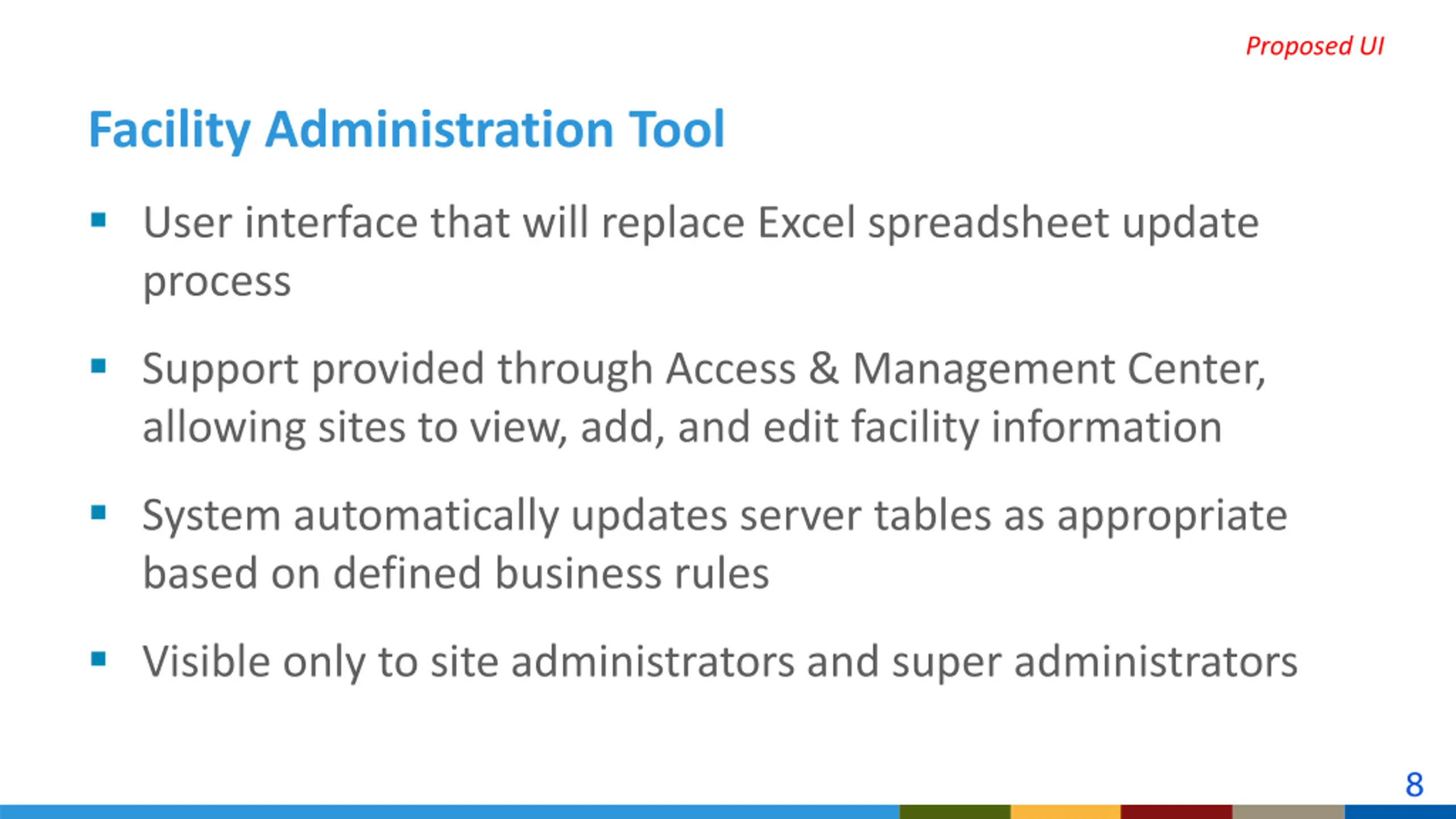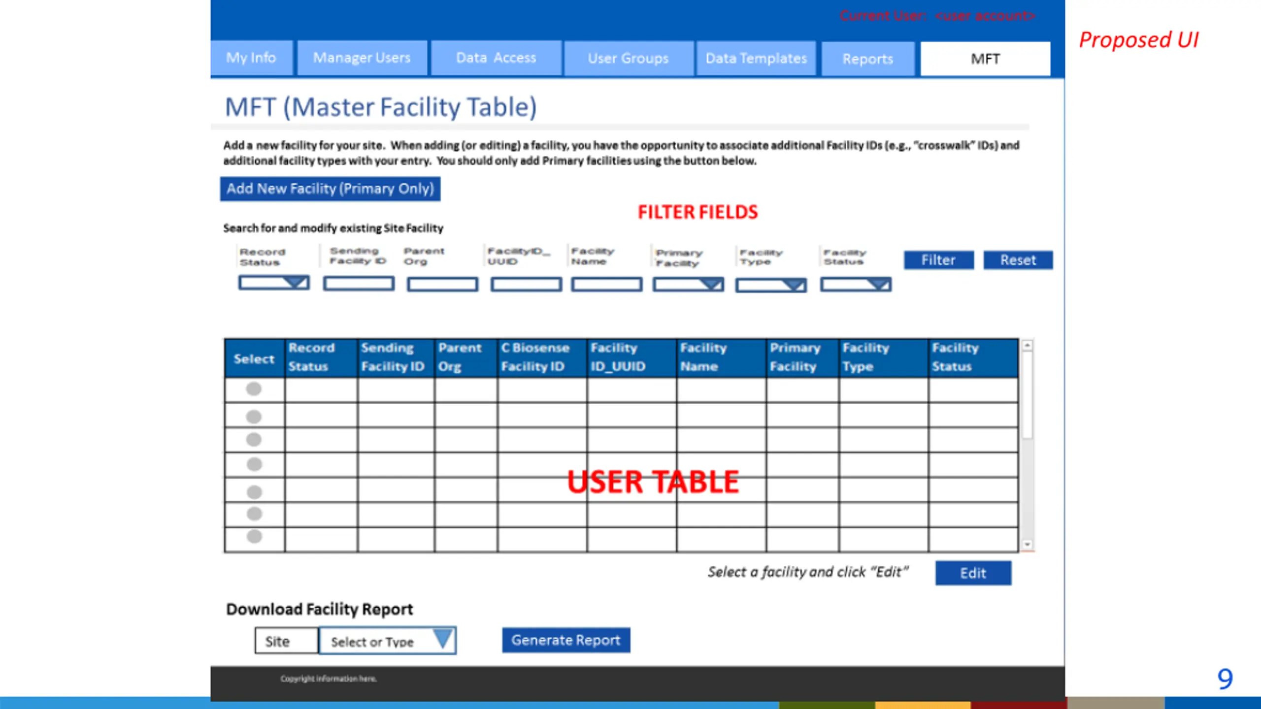 Proposed UI Facility Administration Tool User interface that will replace Excel spreadsheet update process Support provided through Access & Management Center, allowing sites to view, add, and edit facility information System automatically updates server tables as appropriate based on defined business rules Visible only to site administrators and super administrators 8