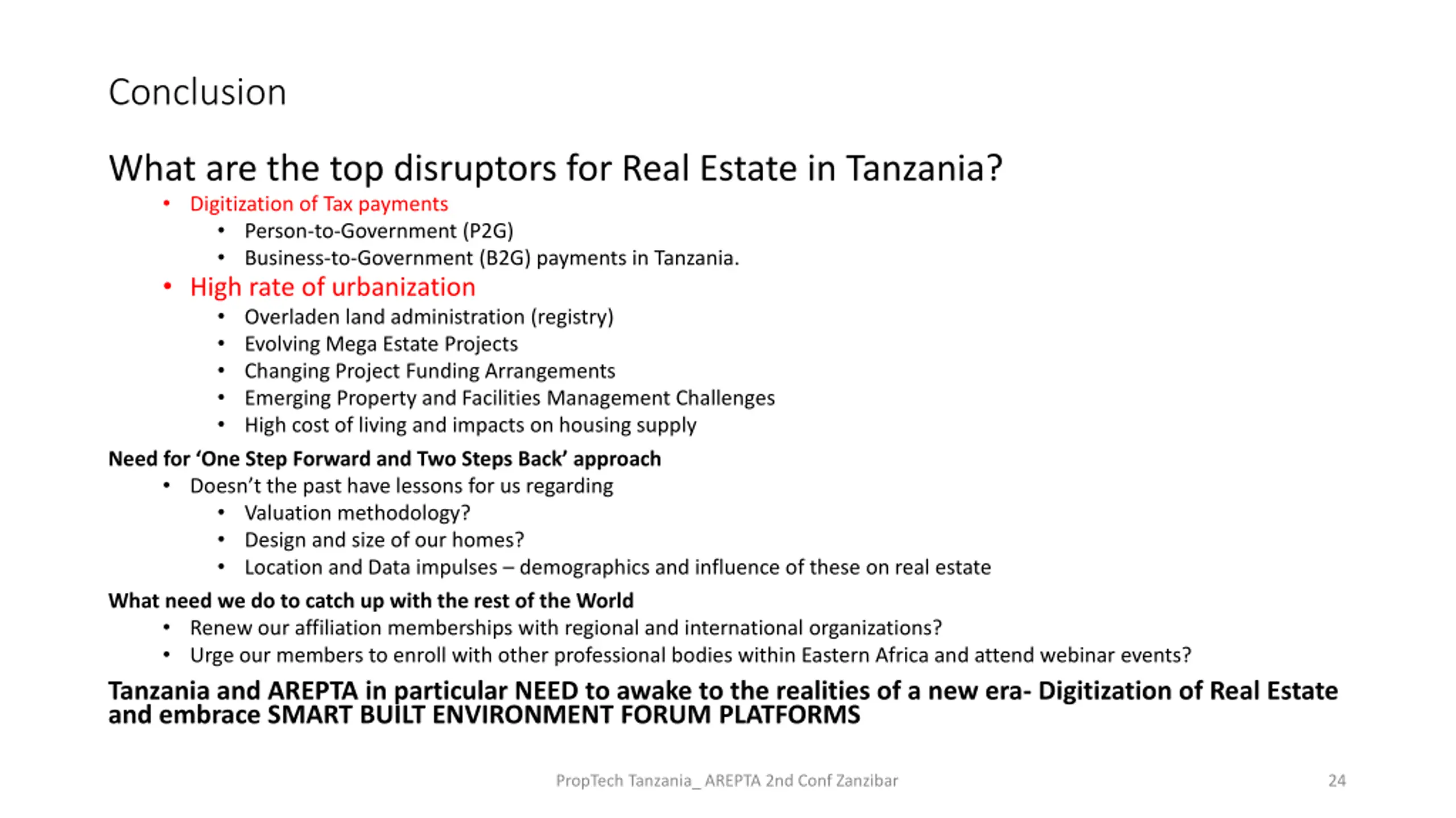 Conclusion What are the top disruptors for Real Estate in Tanzania? Digitization of Tax payments Person-to-Government (P2G) Business-to-Government (B2G) payments in Tanzania. High rate of urbanization Overladen land administration (registry) Evolving Mega Estate Projects Changing Project Funding Arrangements Emerging Property and Facilities Management Challenges High cost of living and impacts on housing supply Need for One Step Forward and Two Steps Back approach Doesn t the past have lessons for us regarding Valuation methodology? Design and size of our homes? Location and Data impulses demographics and influence of these on real estate What need we do to catch up with the rest of the World Renew our affiliation memberships with regional and international organizations? Urge our members to enroll with other professional bodies within Eastern Africa and attend webinar events? Tanzania and AREPTA in particular NEED to awake to the realities of a new era- Digitization of Real Estate and embrace SMART BUILT ENVIRONMENT FORUM PLATFORMS PropTech Tanzania_ AREPTA 2nd Conf Zanzibar 24