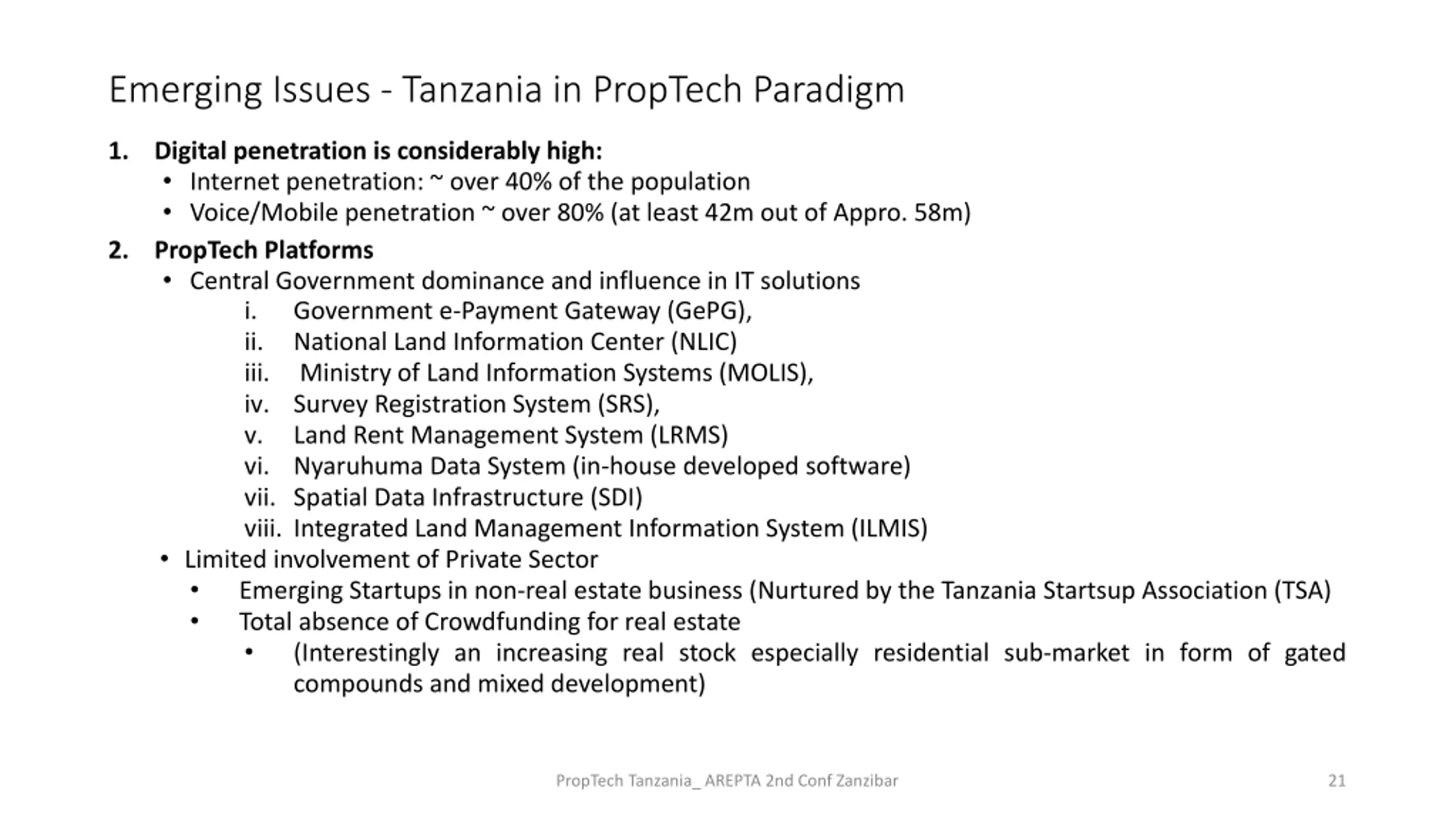 Emerging Issues - Tanzania in PropTech Paradigm 1. Digital penetration is considerably high: Internet penetration: ~ over 40% of the population Voice/Mobile penetration ~ over 80% (at least 42m out of Appro. 58m) PropTech Platforms Central Government dominance and influence in IT solutions i. Government e-Payment Gateway (GePG), ii. National Land Information Center (NLIC) iii. Ministry of Land Information Systems (MOLIS), iv. Survey Registration System (SRS), v. Land Rent Management System (LRMS) vi. Nyaruhuma Data System (in-house developed software) vii. Spatial Data Infrastructure (SDI) viii. Integrated Land Management Information System (ILMIS) Limited involvement of Private Sector Emerging Startups in non-real estate business (Nurtured by the Tanzania Startsup Association (TSA) Total absence of Crowdfunding for real estate (Interestingly an increasing real stock especially residential sub-market in form of gated compounds and mixed development) 2. PropTech Tanzania_ AREPTA 2nd Conf Zanzibar 21