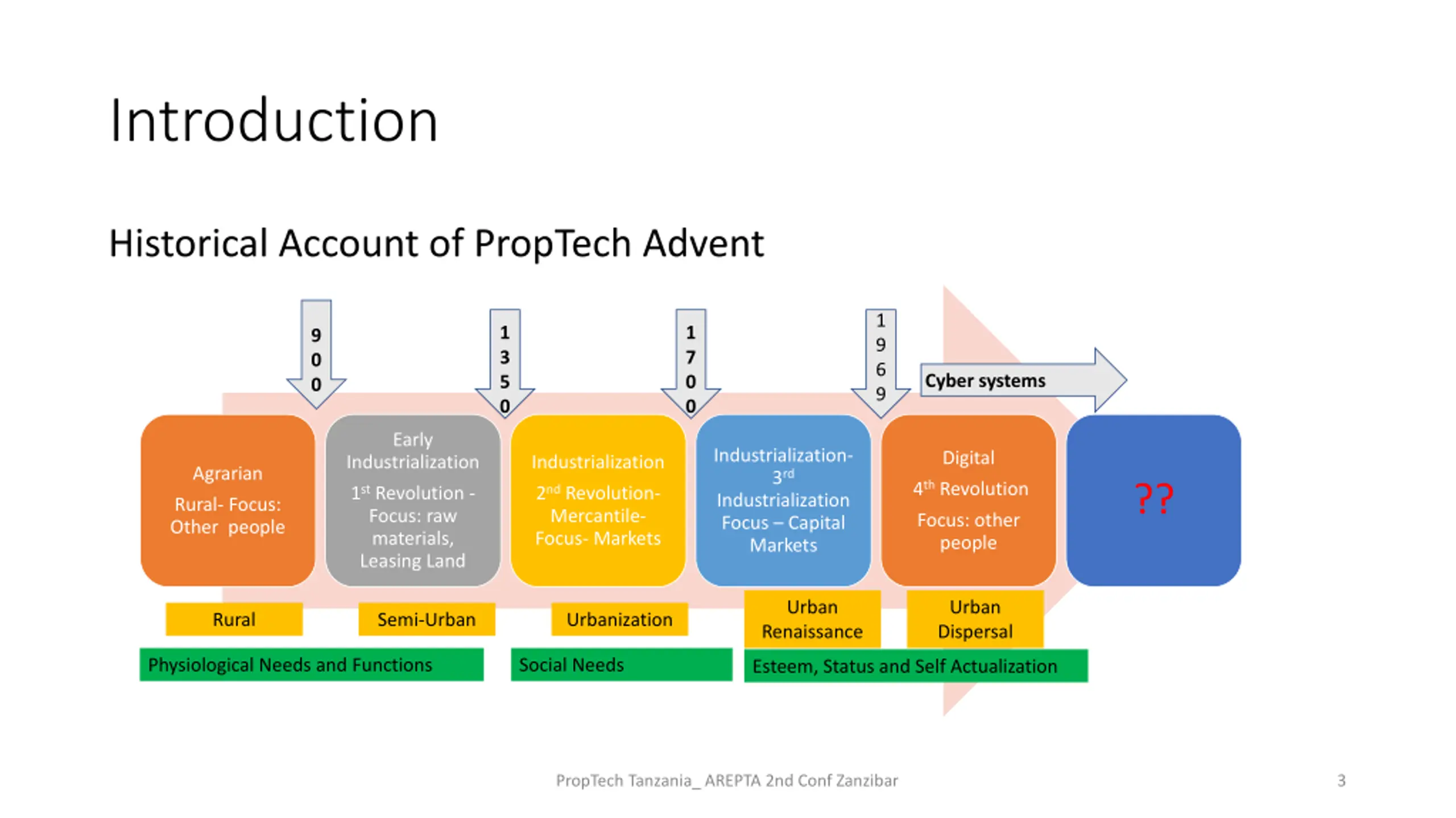 Introduction Historical Account of PropTech Advent 1 9 6 9 1 3 5 0 1 7 0 0 9 0 0 Cyber systems Early Industrialization- 3rd Industrialization Focus Capital Markets Digital Industrialization 1st Revolution - Focus: raw materials, Leasing Land Industrialization 2nd Revolution- Mercantile- Focus- Markets Agrarian 4th Revolution ?? Rural- Focus: Other people Focus: other people Urban Renaissance Urban Dispersal Rural Semi-Urban Urbanization Physiological Needs and Functions Social Needs Esteem, Status and Self Actualization PropTech Tanzania_ AREPTA 2nd Conf Zanzibar 3