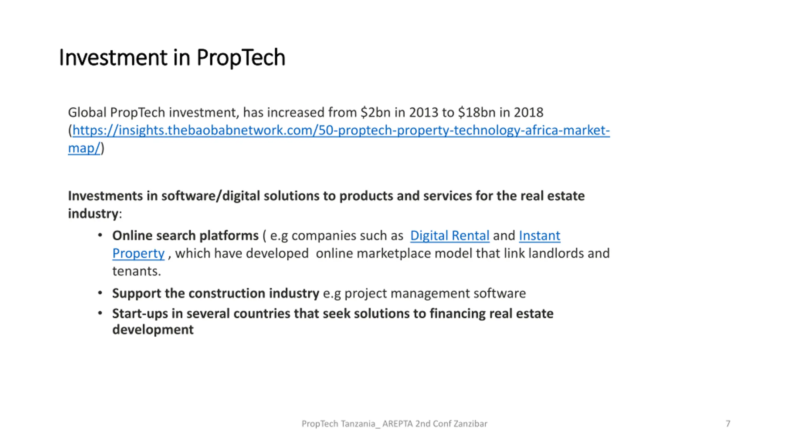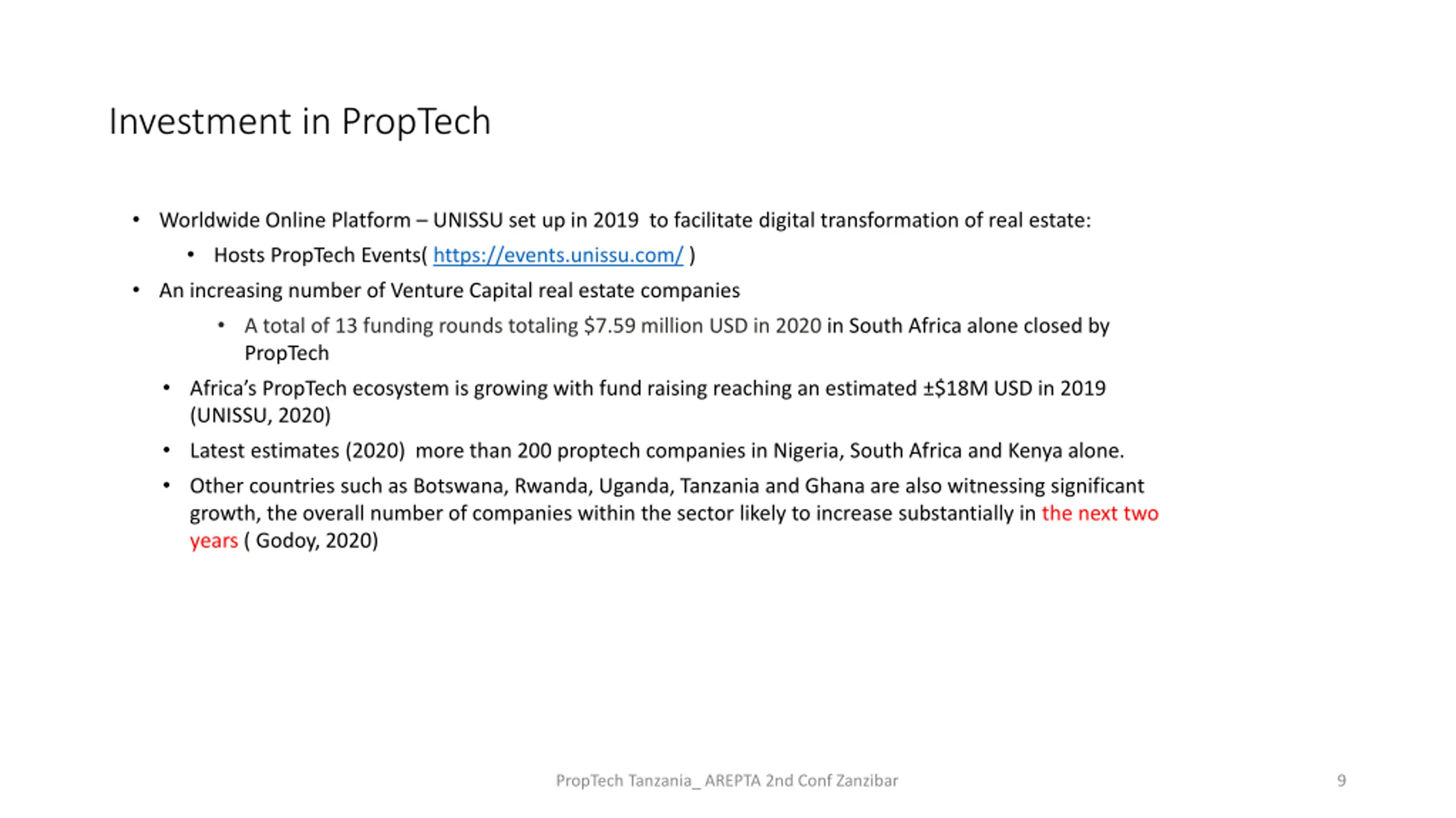 Investment in PropTech Worldwide Online Platform UNISSU set up in 2019 to facilitate digital transformation of real estate: Hosts PropTech Events( https://events.unissu.com/ ) An increasing number of Venture Capital real estate companies A total of 13 funding rounds totaling $7.59 million USD in 2020 in South Africa alone closed by PropTech Africa s PropTech ecosystem is growing with fund raising reaching an estimated $18M USD in 2019 (UNISSU, 2020) Latest estimates (2020) more than 200 proptech companies in Nigeria, South Africa and Kenya alone. Other countries such as Botswana, Rwanda, Uganda, Tanzania and Ghana are also witnessing significant growth, the overall number of companies within the sector likely to increase substantially in the next two years ( Godoy, 2020) PropTech Tanzania_ AREPTA 2nd Conf Zanzibar 9