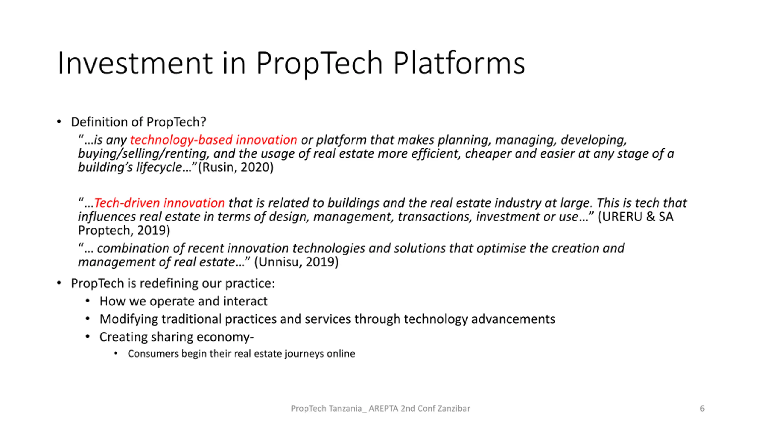 Investment in PropTech Platforms Definition of PropTech? is any technology-based innovation or platform that makes planning, managing, developing, buying/selling/renting, and the usage of real estate more efficient, cheaper and easier at any stage of a building s lifecycle (Rusin, 2020) Tech-driven innovation that is related to buildings and the real estate industry at large. This is tech that influences real estate in terms of design, management, transactions, investment or use (URERU & SA Proptech, 2019) combination of recent innovation technologies and solutions that optimise the creation and management of real estate (Unnisu, 2019) PropTech is redefining our practice: How we operate and interact Modifying traditional practices and services through technology advancements Creating sharing economy- Consumers begin their real estate journeys online PropTech Tanzania_ AREPTA 2nd Conf Zanzibar 6