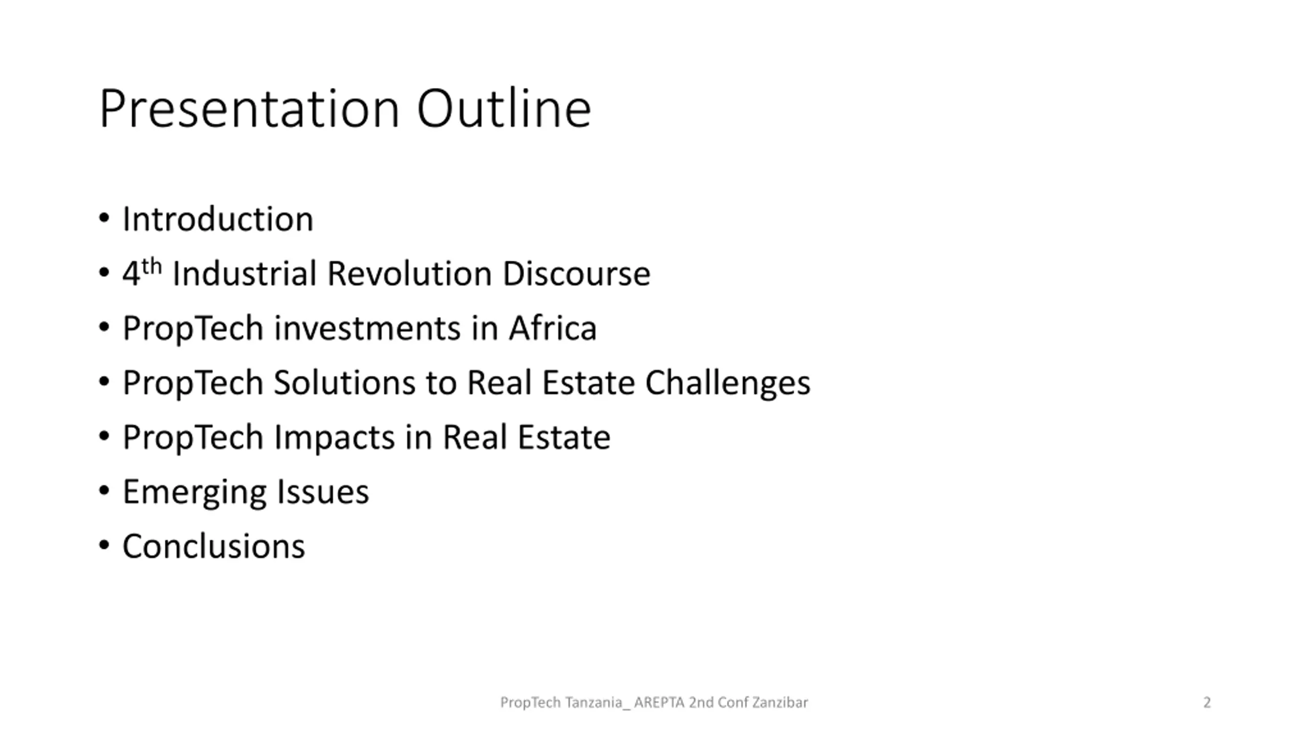 Presentation Outline Introduction 4th Industrial Revolution Discourse PropTech investments in Africa PropTech Solutions to Real Estate Challenges PropTech Impacts in Real Estate Emerging Issues Conclusions PropTech Tanzania_ AREPTA 2nd Conf Zanzibar 2