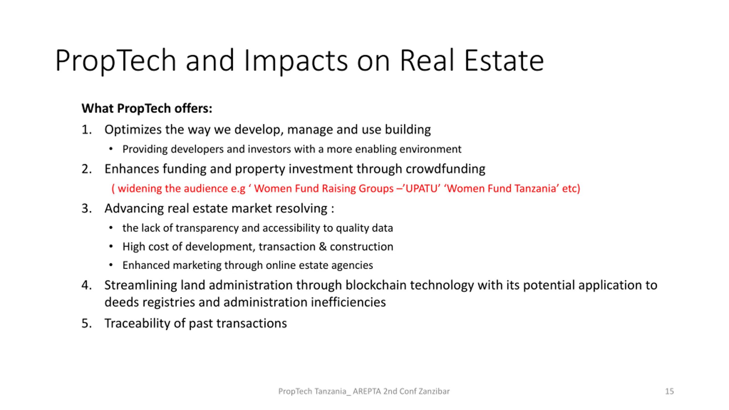 PropTech and Impacts on Real Estate What PropTech offers: 1. Optimizes the way we develop, manage and use building Providing developers and investors with a more enabling environment 2. Enhances funding and property investment through crowdfunding ( widening the audience e.g Women Fund Raising Groups UPATU Women Fund Tanzania etc) 3. Advancing real estate market resolving : the lack of transparency and accessibility to quality data High cost of development, transaction & construction Enhanced marketing through online estate agencies 4. Streamlining land administration through blockchain technology with its potential application to deeds registries and administration inefficiencies 5. Traceability of past transactions PropTech Tanzania_ AREPTA 2nd Conf Zanzibar 15