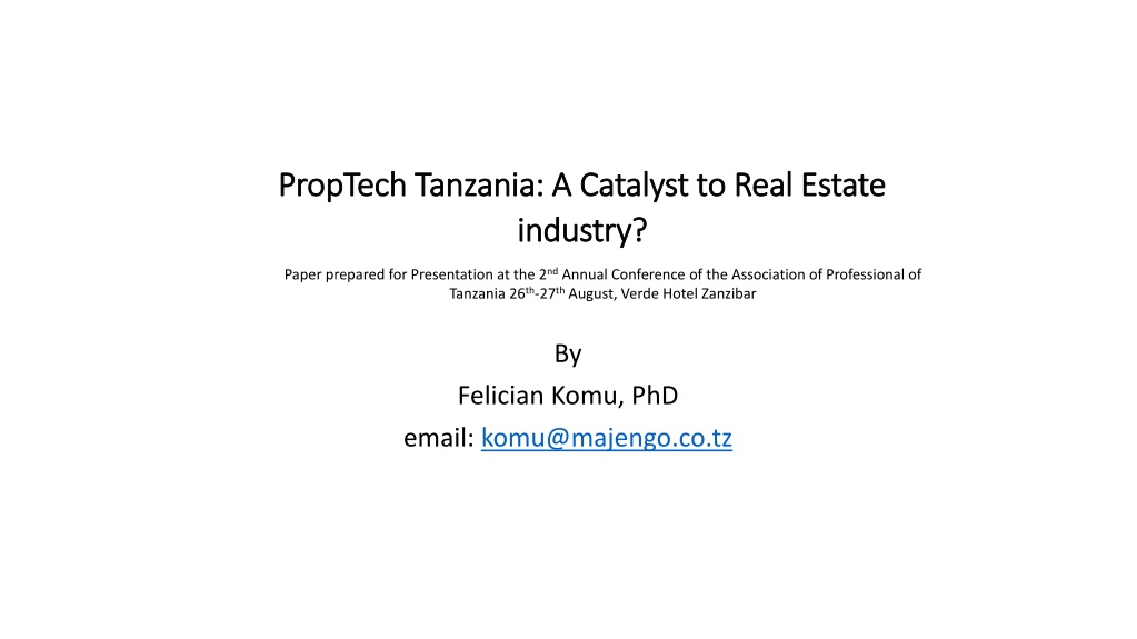 PropTech PropTech Tanzania: A Catalyst to Real Estate Tanzania: A Catalyst to Real Estate industry? industry? Paper prepared for Presentation at the 2nd Annual Conference of the Association of Professional of Tanzania 26th-27th August, Verde Hotel Zanzibar By Felician Komu, PhD email: komu@majengo.co.tz