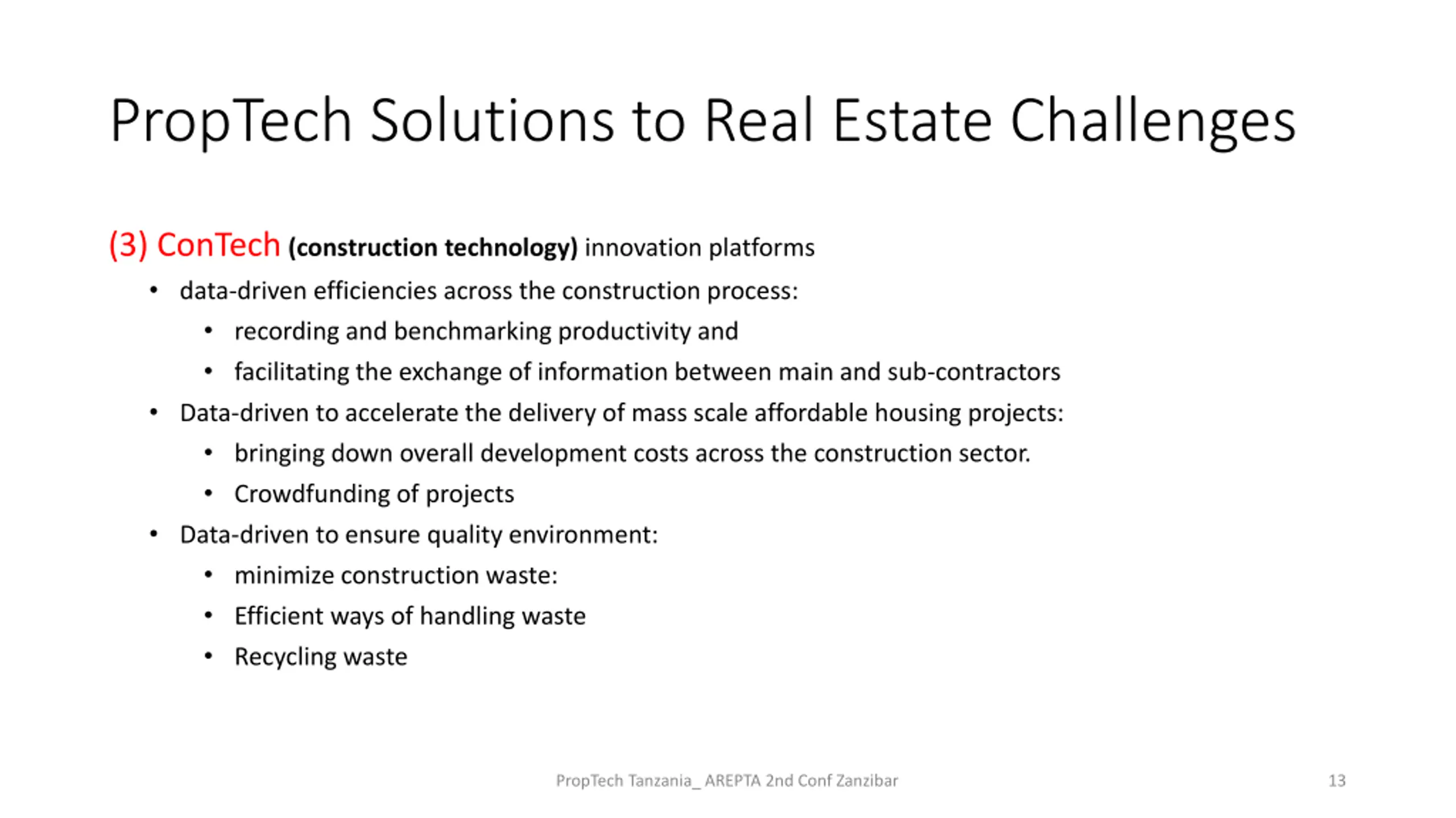 PropTech Solutions to Real Estate Challenges (3) ConTech (construction technology) innovation platforms data-driven efficiencies across the construction process: recording and benchmarking productivity and facilitating the exchange of information between main and sub-contractors Data-driven to accelerate the delivery of mass scale affordable housing projects: bringing down overall development costs across the construction sector. Crowdfunding of projects Data-driven to ensure quality environment: minimize construction waste: Efficient ways of handling waste Recycling waste PropTech Tanzania_ AREPTA 2nd Conf Zanzibar 13