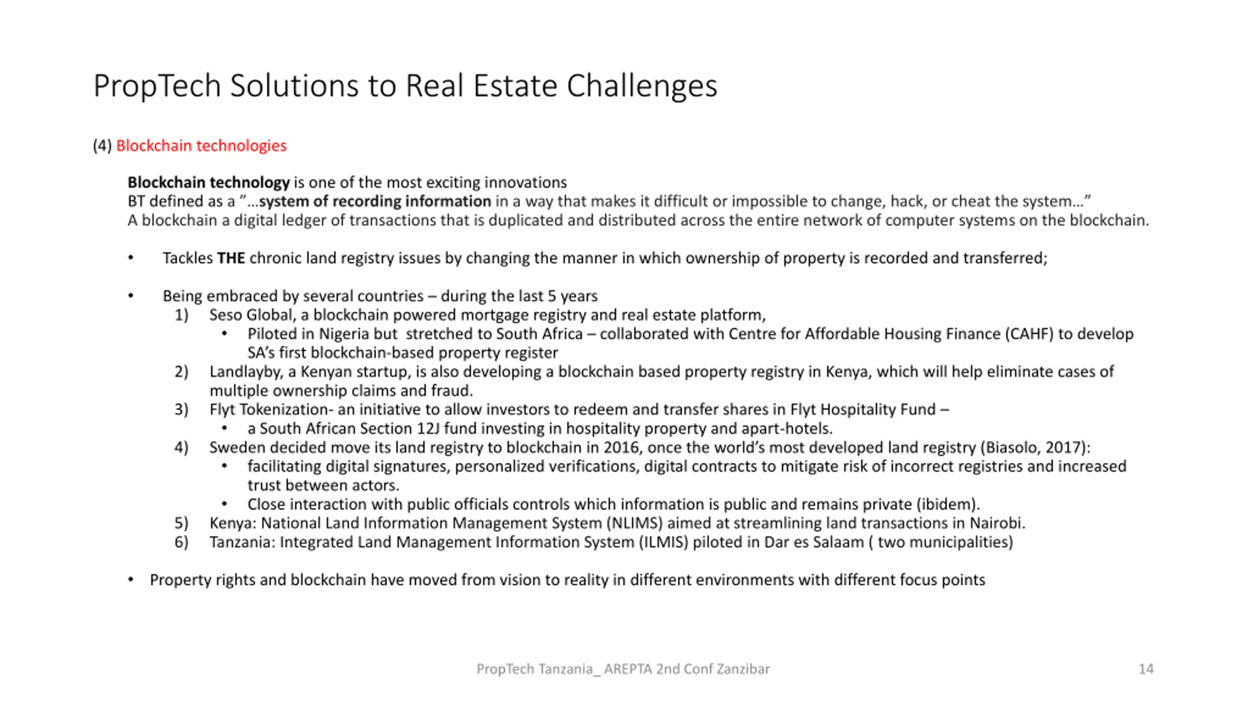 PropTech Solutions to Real Estate Challenges (4) Blockchain technologies Blockchain technology is one of the most exciting innovations BT defined as a system of recording information in a way that makes it difficult or impossible to change, hack, or cheat the system A blockchain a digital ledger of transactions that is duplicated and distributed across the entire network of computer systems on the blockchain. Tackles THE chronic land registry issues by changing the manner in which ownership of property is recorded and transferred; Being embraced by several countries during the last 5 years 1) Seso Global, a blockchain powered mortgage registry and real estate platform, Piloted in Nigeria but stretched to South Africa collaborated with Centre for Affordable Housing Finance (CAHF) to develop SA s first blockchain-based property register 2) Landlayby, a Kenyan startup, is also developing a blockchain based property registry in Kenya, which will help eliminate cases of multiple ownership claims and fraud. 3) Flyt Tokenization- an initiative to allow investors to redeem and transfer shares in Flyt Hospitality Fund a South African Section 12J fund investing in hospitality property and apart-hotels. 4) Sweden decided move its land registry to blockchain in 2016, once the world s most developed land registry (Biasolo, 2017): facilitating digital signatures, personalized verifications, digital contracts to mitigate risk of incorrect registries and increased trust between actors. Close interaction with public officials controls which information is public and remains private (ibidem). 5) Kenya: National Land Information Management System (NLIMS) aimed at streamlining land transactions in Nairobi. 6) Tanzania: Integrated Land Management Information System (ILMIS) piloted in Dar es Salaam ( two municipalities) Property rights and blockchain have moved from vision to reality in different environments with different focus points PropTech Tanzania_ AREPTA 2nd Conf Zanzibar 14