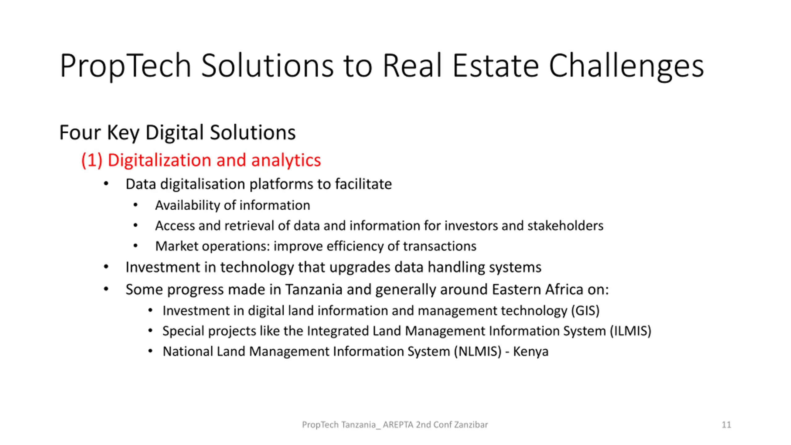 PropTech Solutions to Real Estate Challenges Four Key Digital Solutions (1) Digitalization and analytics Data digitalisation platforms to facilitate Availability of information Access and retrieval of data and information for investors and stakeholders Market operations: improve efficiency of transactions Investment in technology that upgrades data handling systems Some progress made in Tanzania and generally around Eastern Africa on: Investment in digital land information and management technology (GIS) Special projects like the Integrated Land Management Information System (ILMIS) National Land Management Information System (NLMIS) - Kenya PropTech Tanzania_ AREPTA 2nd Conf Zanzibar 11