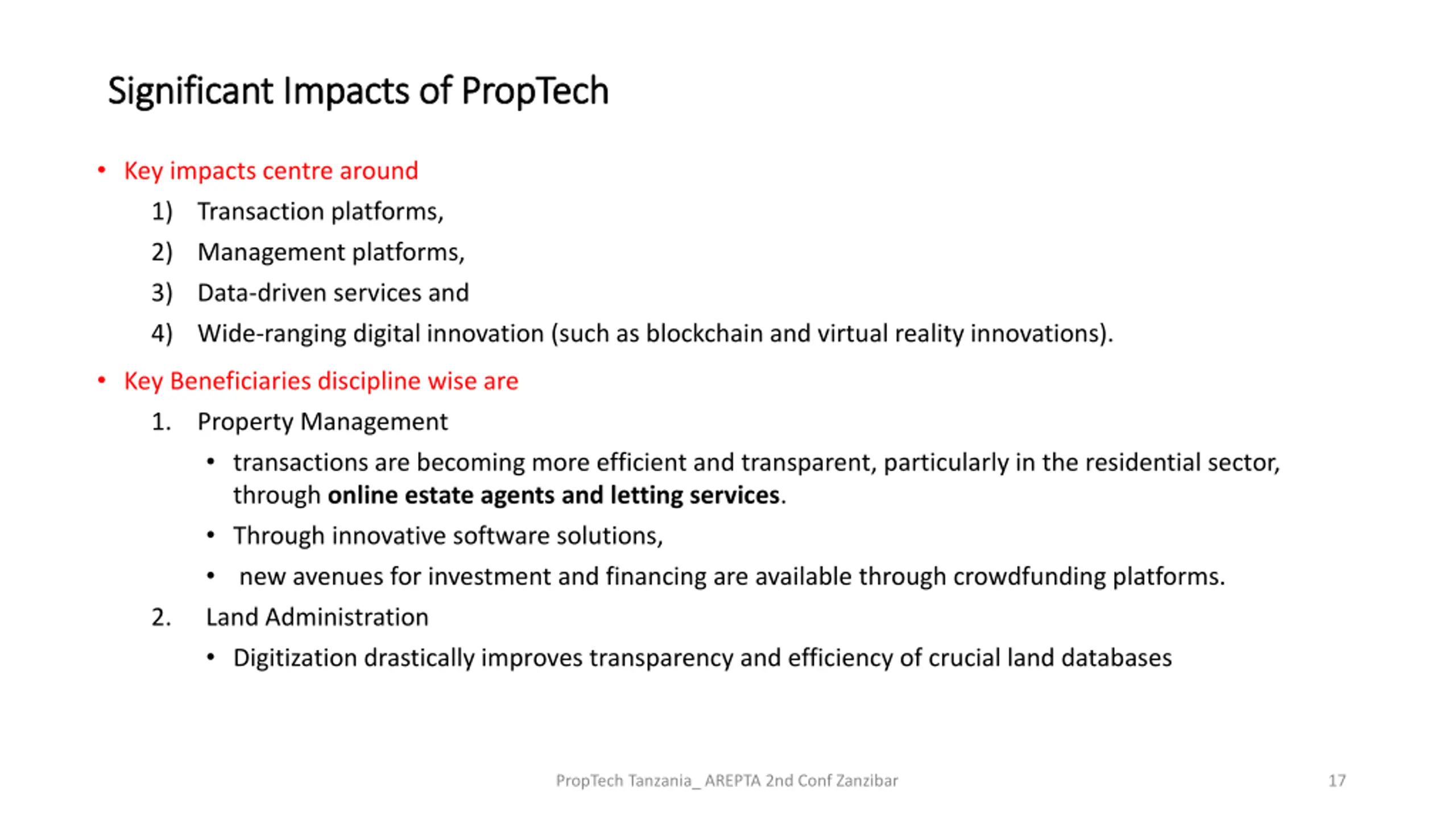 Significant Impacts of Significant Impacts of PropTech PropTech Key impacts centre around 1) Transaction platforms, 2) Management platforms, 3) Data-driven services and 4) Wide-ranging digital innovation (such as blockchain and virtual reality innovations). Key Beneficiaries discipline wise are 1. Property Management transactions are becoming more efficient and transparent, particularly in the residential sector, through online estate agents and letting services. Through innovative software solutions, new avenues for investment and financing are available through crowdfunding platforms. 2. Land Administration Digitization drastically improves transparency and efficiency of crucial land databases PropTech Tanzania_ AREPTA 2nd Conf Zanzibar 17