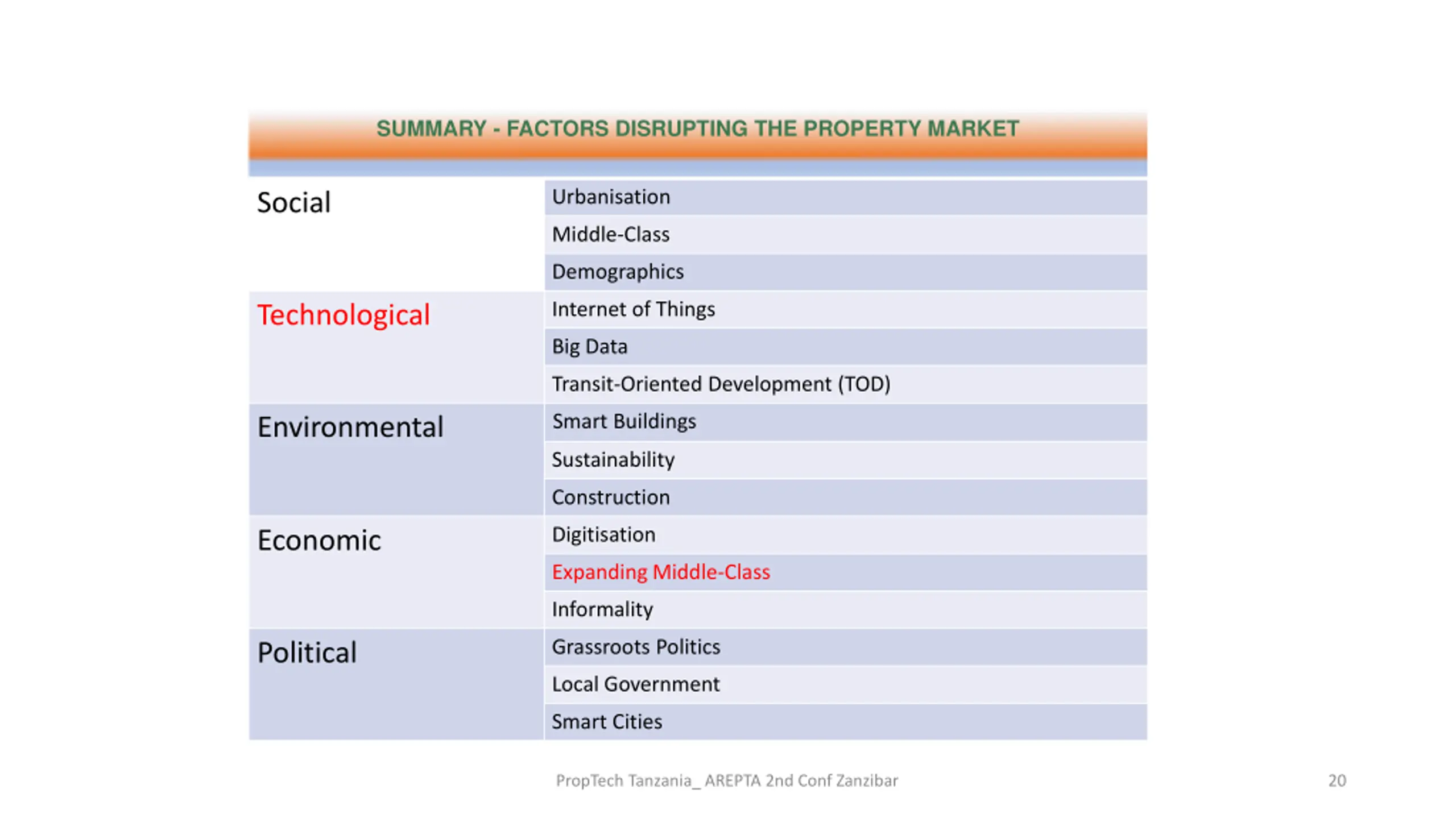 SUMMARY - FACTORS DISRUPTING THE PROPERTY MARKET Urbanisation Social Middle-Class Demographics Internet of Things Technological Big Data Transit-Oriented Development (TOD) Smart Buildings Environmental Sustainability Construction Digitisation Economic Expanding Middle-Class Informality Grassroots Politics Political Local Government Smart Cities PropTech Tanzania_ AREPTA 2nd Conf Zanzibar 20