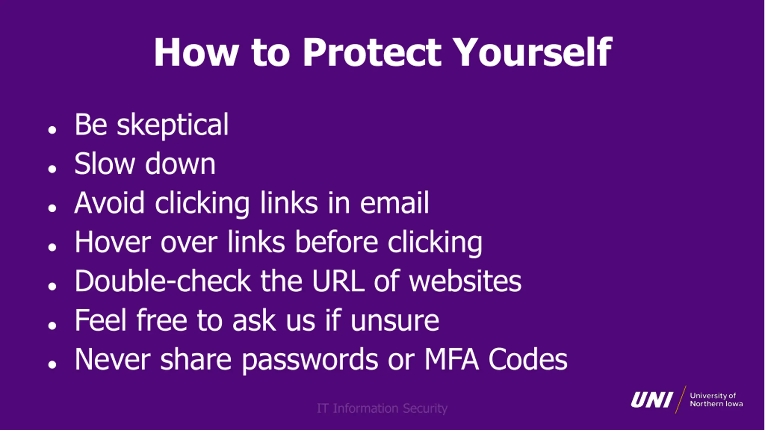 How to Protect Yourself Be skeptical Slow down Avoid clicking links in email Hover over links before clicking Double-check the URL of websites Feel free to ask us if unsure Never share passwords or MFA Codes
