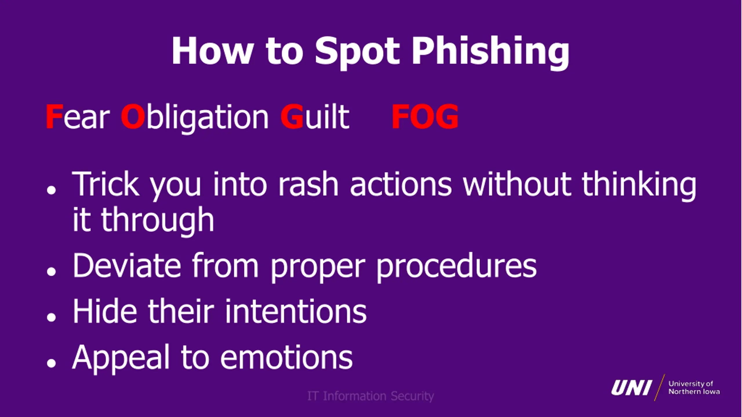How to Spot Phishing Fear Obligation Guilt FOG Trick you into rash actions without thinking it through Deviate from proper procedures Hide their intentions Appeal to emotions