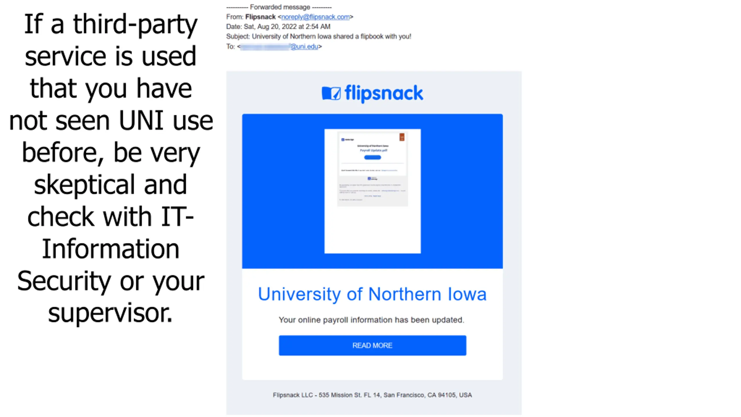 If a third-party service is used that you have not seen UNI use before, be very skeptical and check with IT- Information Security or your supervisor.