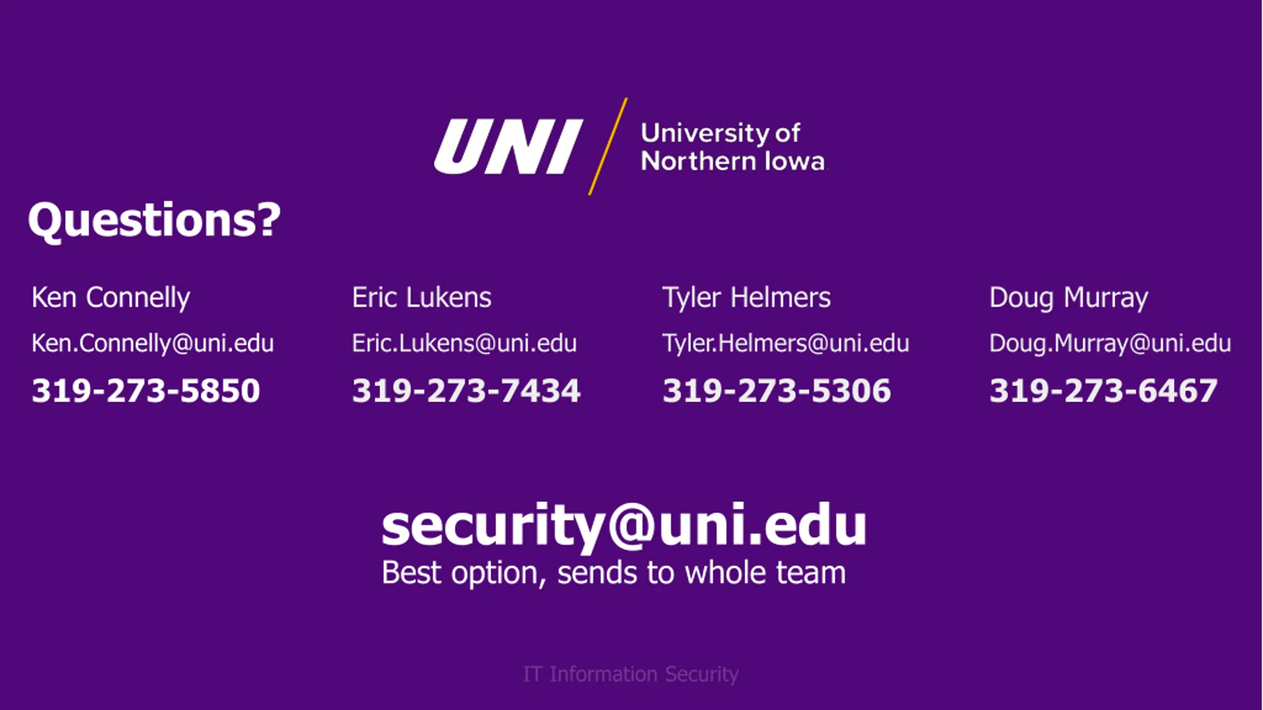 Questions? Ken Connelly Eric Lukens Tyler Helmers Doug Murray Ken.Connelly@uni.edu 319-273-5850 Eric.Lukens@uni.edu 319-273-7434 Tyler.Helmers@uni.edu 319-273-5306 Doug.Murray@uni.edu 319-273-6467 security@uni.edu Best option, sends to whole team