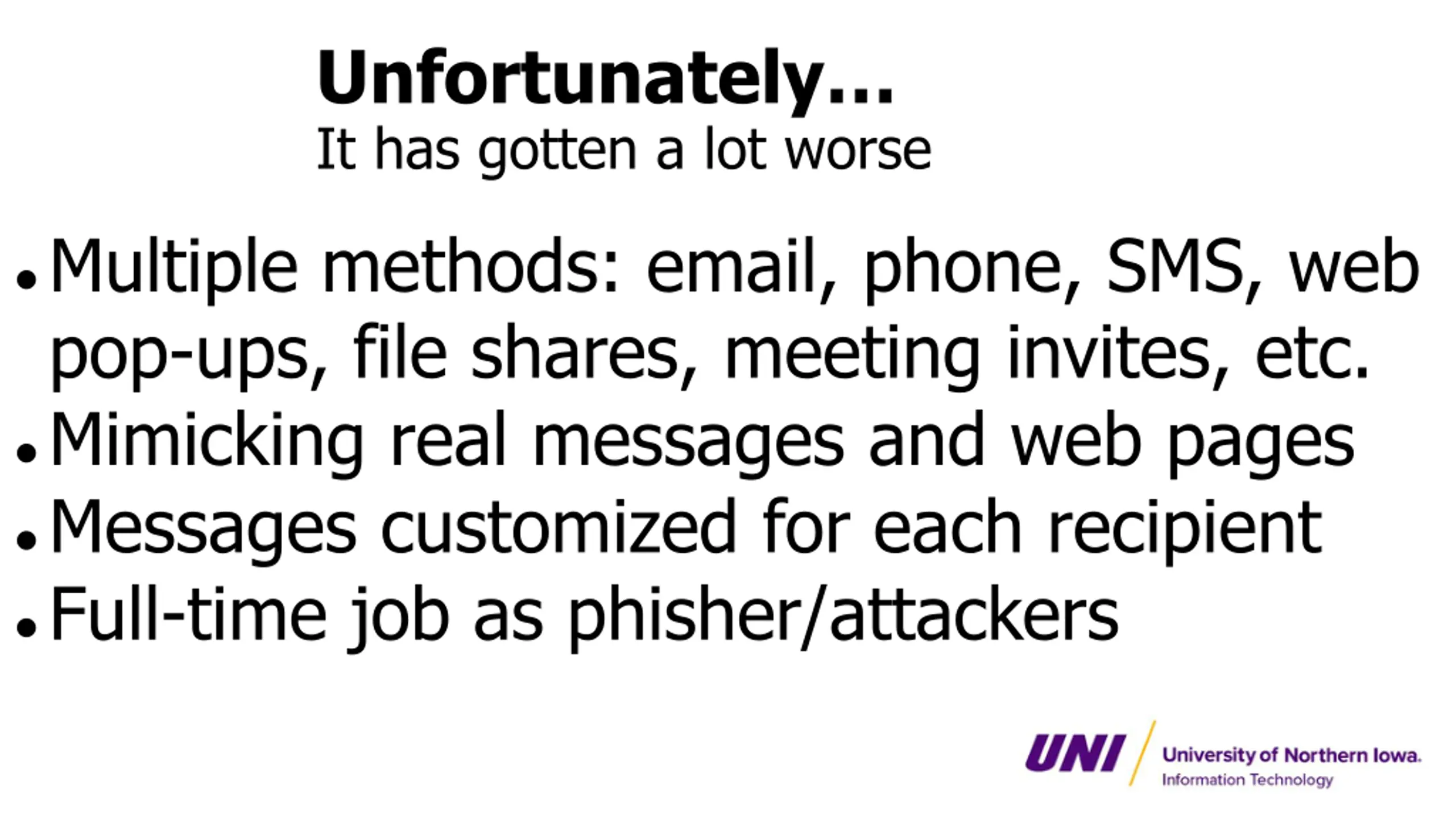 Unfortunately It has gotten a lot worse Multiple methods: email, phone, SMS, web pop-ups, file shares, meeting invites, etc. Mimicking real messages and web pages Messages customized for each recipient Full-time job as phisher/attackers