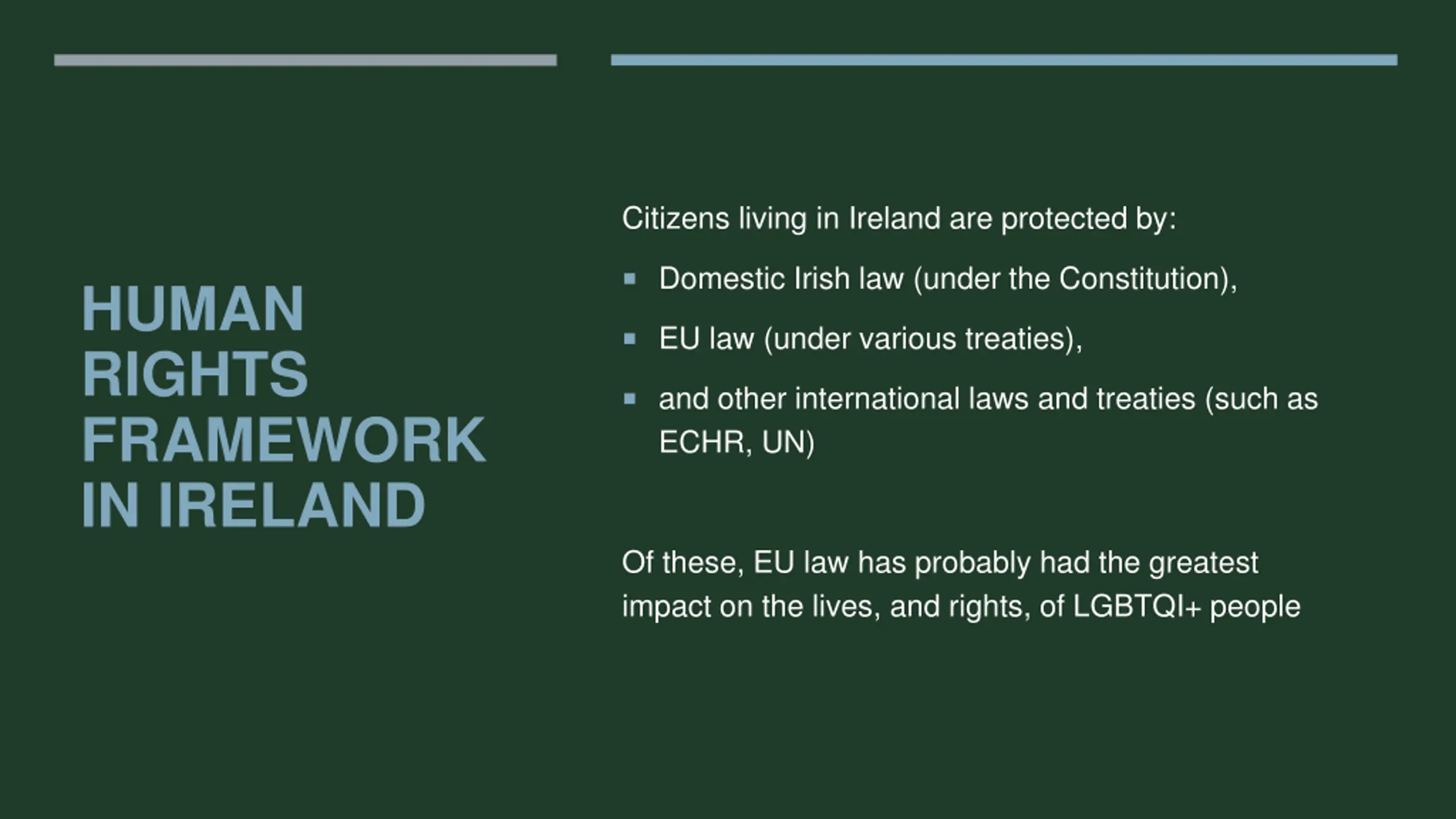 Citizens living in Ireland are protected by: Domestic Irish law (under the Constitution), HUMAN RIGHTS FRAMEWORK IN IRELAND EU law (under various treaties), and other international laws and treaties (such as ECHR, UN) Of these, EU law has probably had the greatest impact on the lives, and rights, of LGBTQI+ people
