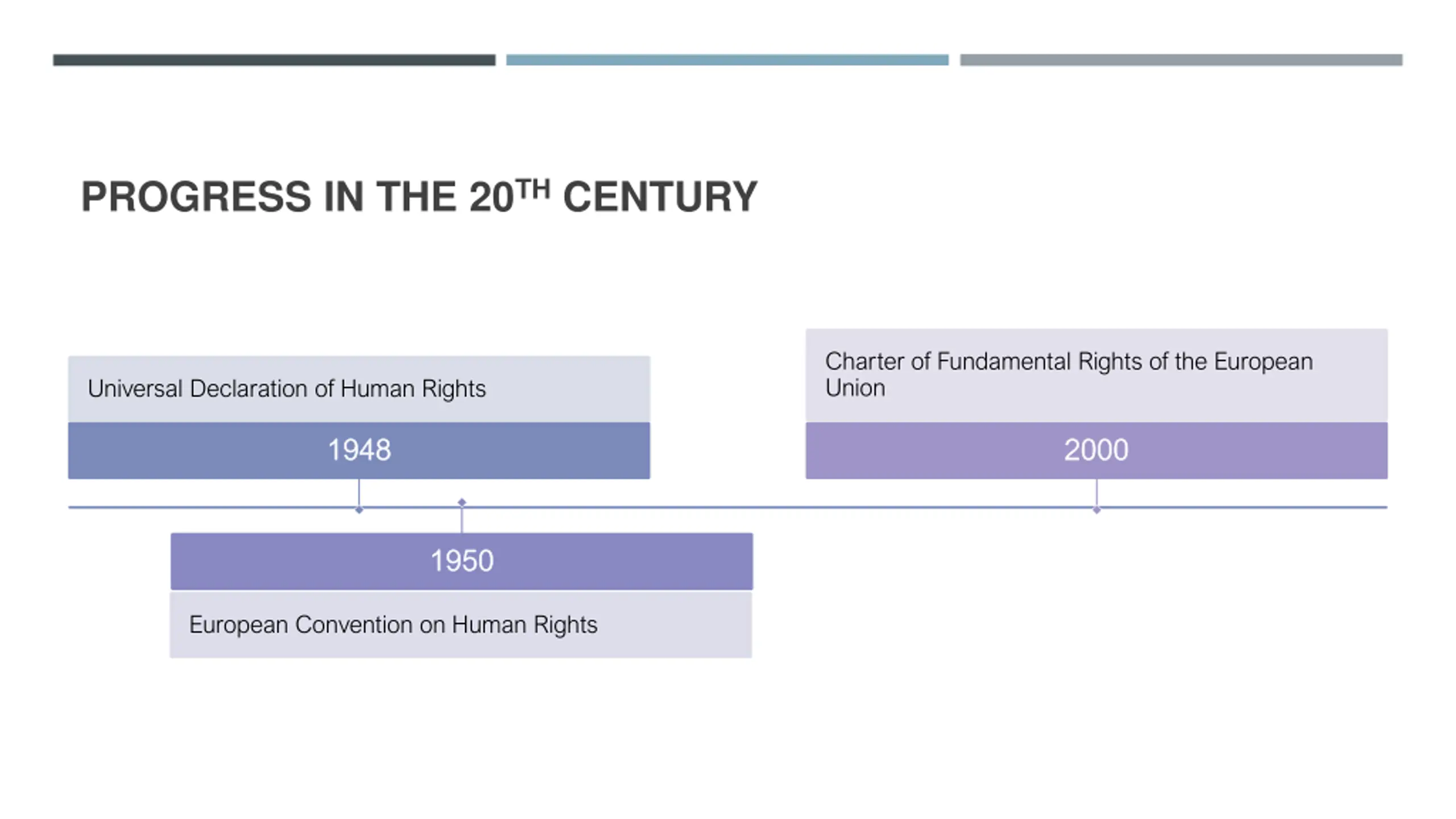 PROGRESS IN THE 20THCENTURY Charter of Fundamental Rights of the European Union Universal Declaration of Human Rights 1948 1948 2000 2000 1950 1950 European Convention on Human Rights