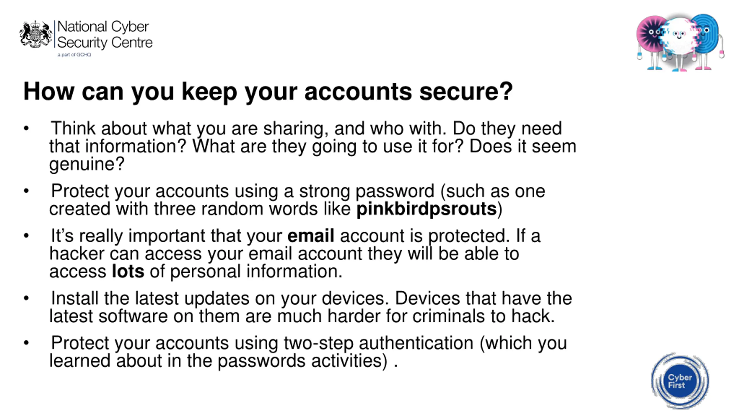 How can you keep your accounts secure? Think about what you are sharing, and who with. Do they need that information? What are they going to use it for? Does it seem genuine? Protect your accounts using a strong password (such as one created with three random words like pinkbirdpsrouts) It s really important that your email account is protected. If a hacker can access your email account they will be able to access lots of personal information. Install the latest updates on your devices. Devices that have the latest software on them are much harder for criminals to hack. Protect your accounts using two-step authentication (which you learned about in the passwords activities) .