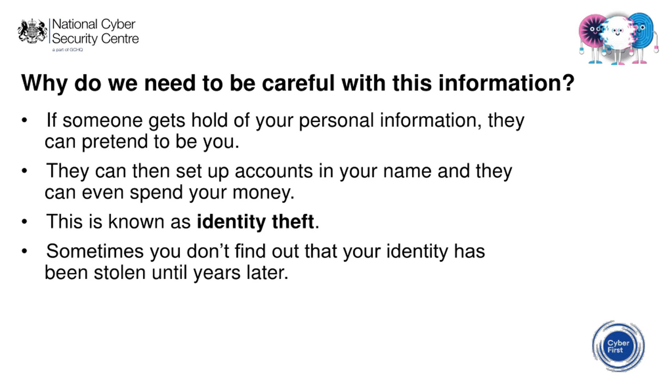 Why do we need to be careful with this information? If someone gets hold of your personal information, they can pretend to be you. They can then set up accounts in your name and they can even spend your money. This is known as identity theft. Sometimes you don t find out that your identity has been stolen until years later.