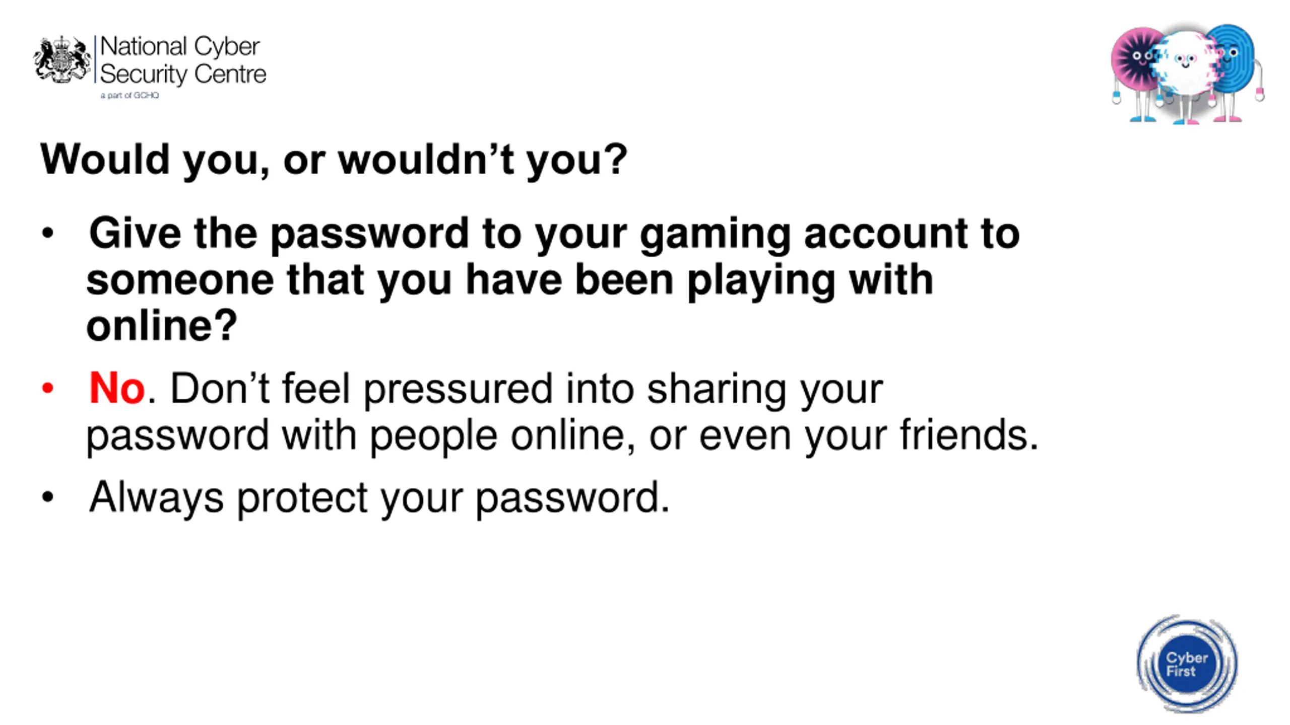 Would you, or wouldnt you? Give the password to your gaming account to someone that you have been playing with online? No. Don t feel pressured into sharing your password with people online, or even your friends. Always protect your password.