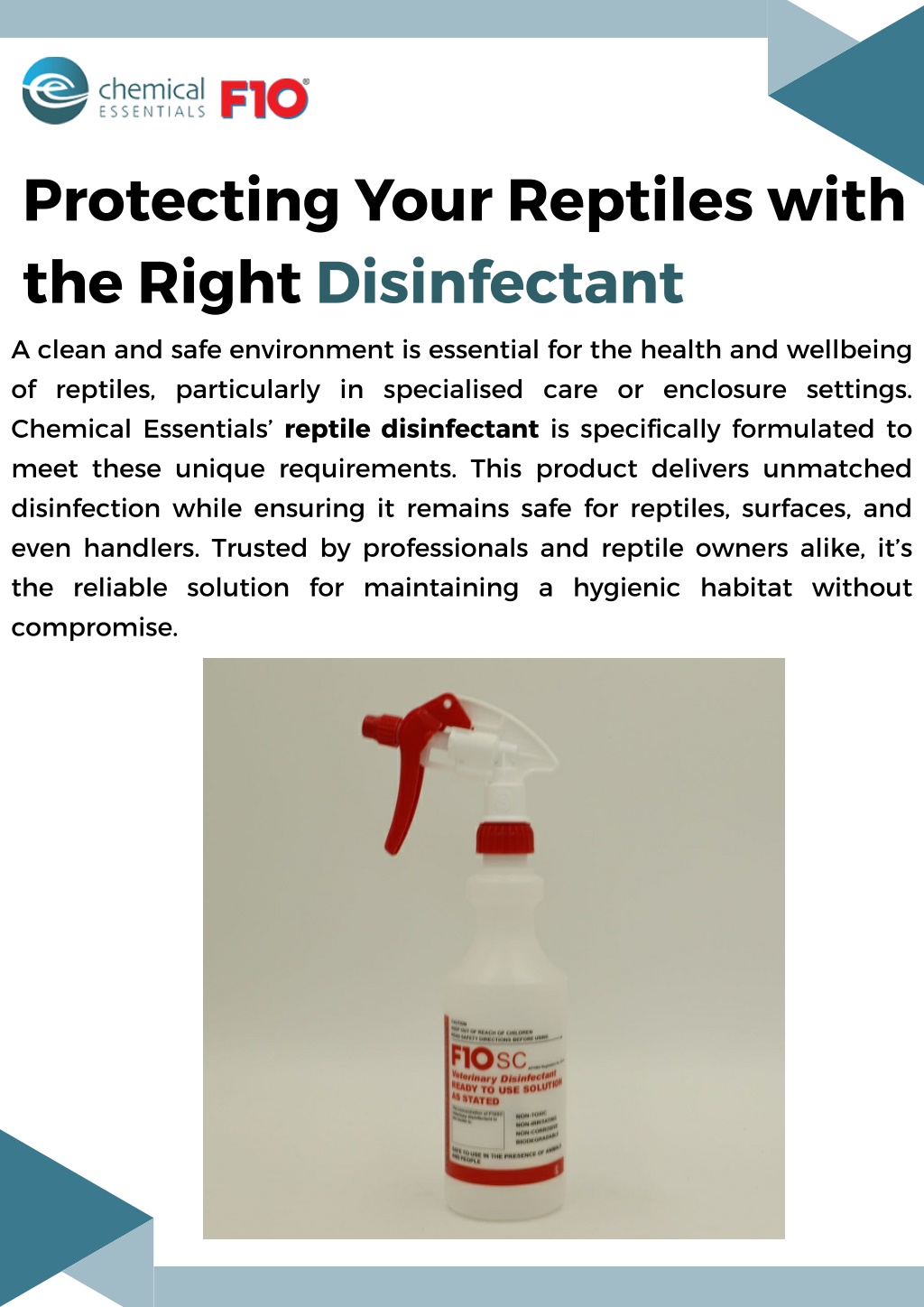 Protecting Your Reptiles with the Right Disinfectant A clean and safe environment is essential for the health and wellbeing of reptiles, particularly in specialised care or enclosure settings. Chemical Essentials reptile disinfectant is specifically formulated to meet these unique requirements. This product delivers unmatched disinfection while ensuring it remains safe for reptiles, surfaces, and even handlers. Trusted by professionals and reptile owners alike, it s the reliable solution for maintaining a hygienic habitat without compromise.