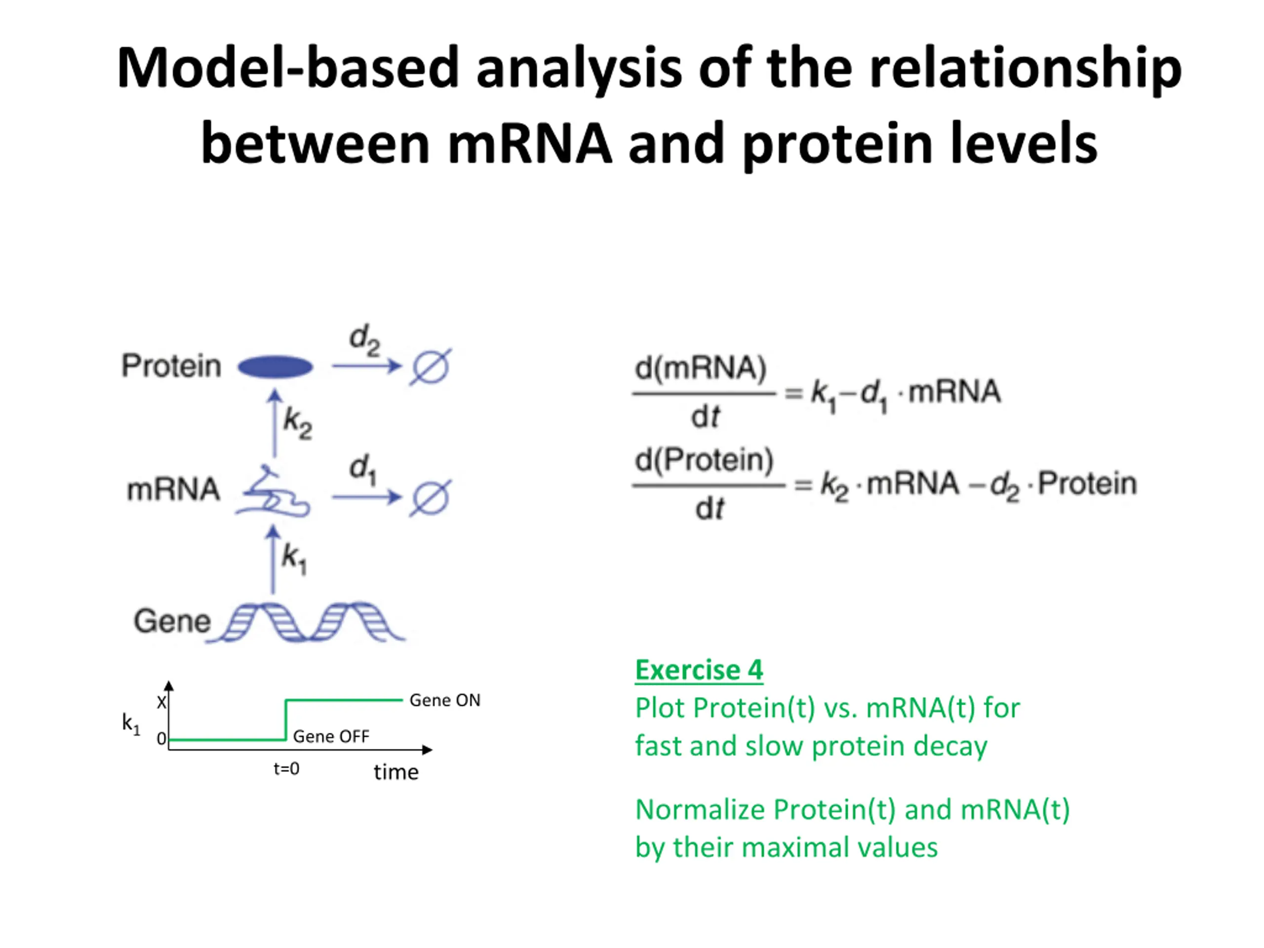 Model-based analysis of the relationship between mRNA and protein levels Exercise 4 Plot Protein(t) vs. mRNA(t) for fast and slow protein decay Gene ON X k1 Gene OFF 0 t=0 time Normalize Protein(t) and mRNA(t) by their maximal values