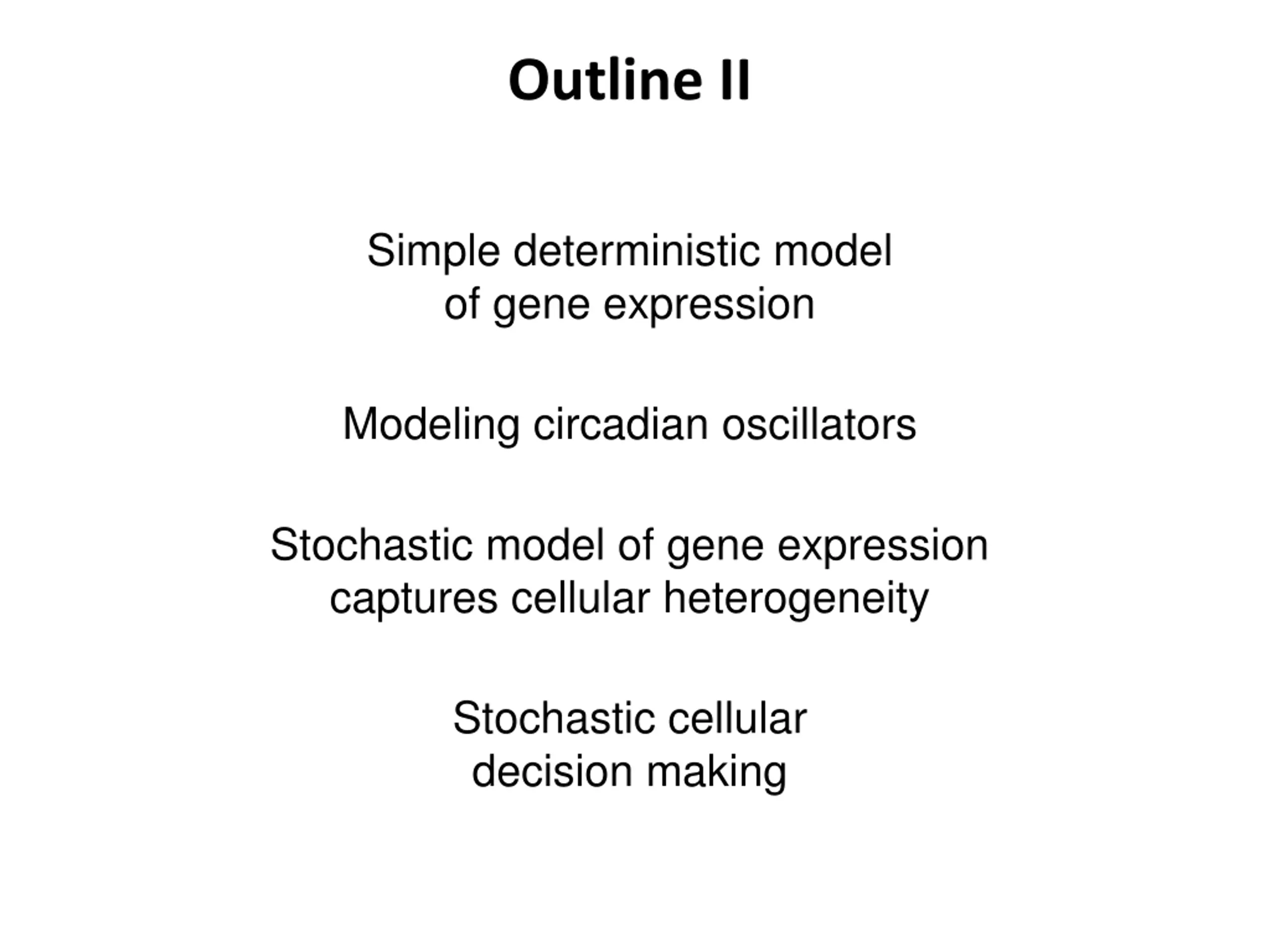 Outline II Simple deterministic model of gene expression Modeling circadian oscillators Stochastic model of gene expression captures cellular heterogeneity Stochastic cellular decision making