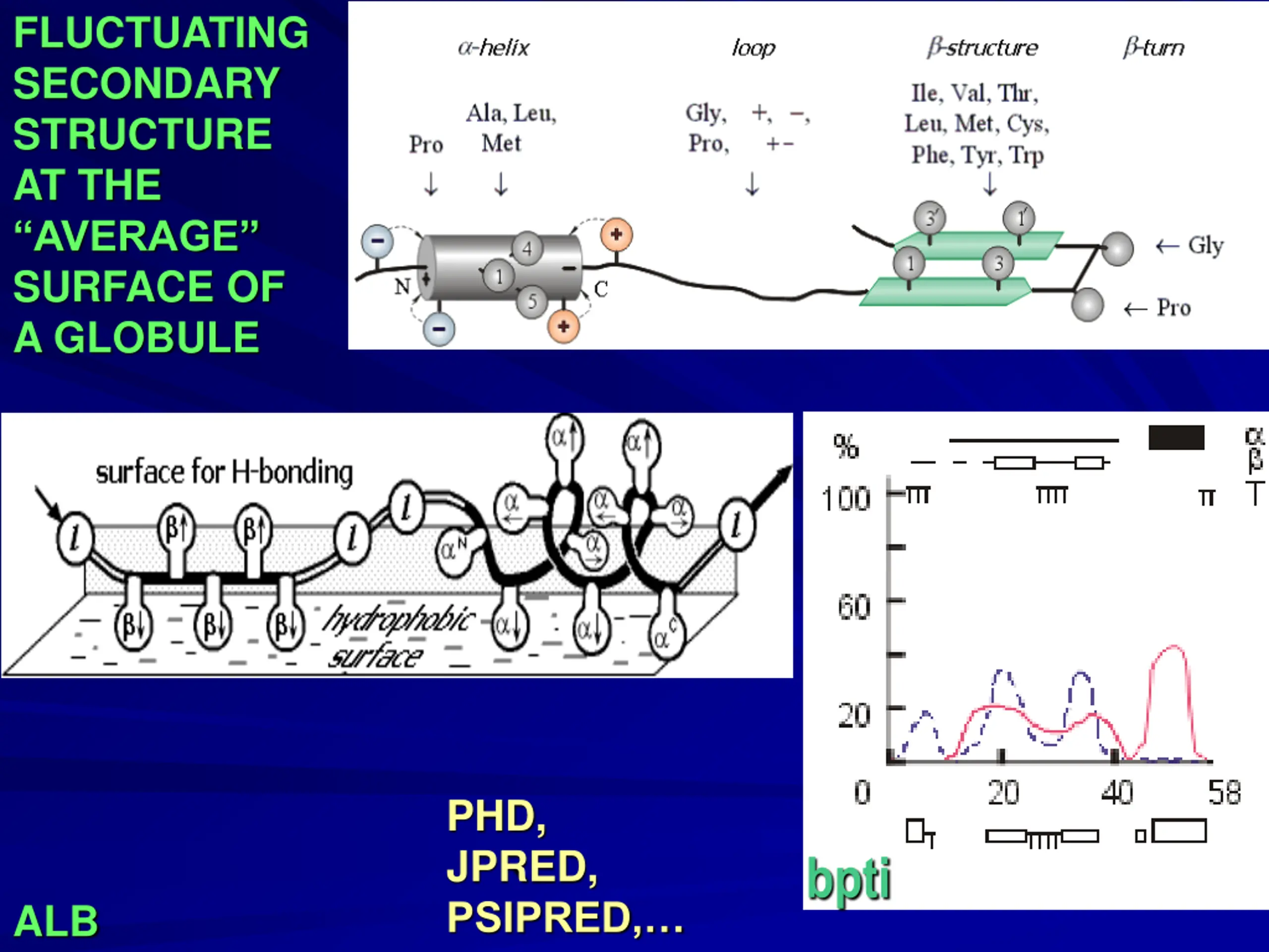 FLUCTUATING SECONDARY STRUCTURE AT THE AVERAGE SURFACE OF A GLOBULE PHD, JPRED, PSIPRED, bpti ALB