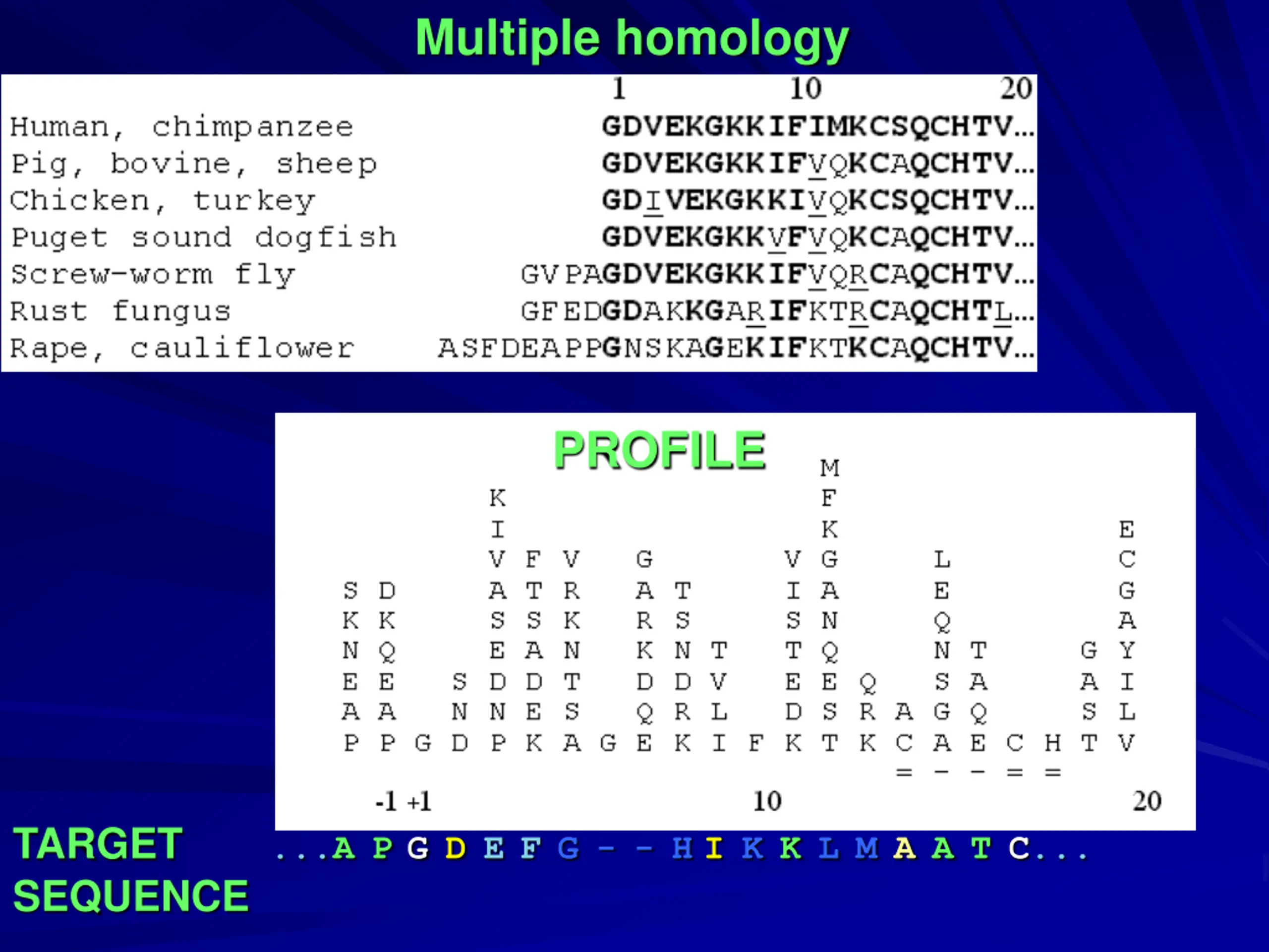 Multiple homology PROFILE TARGET...APGDEFG--HIKKLMAATC... SEQUENCE