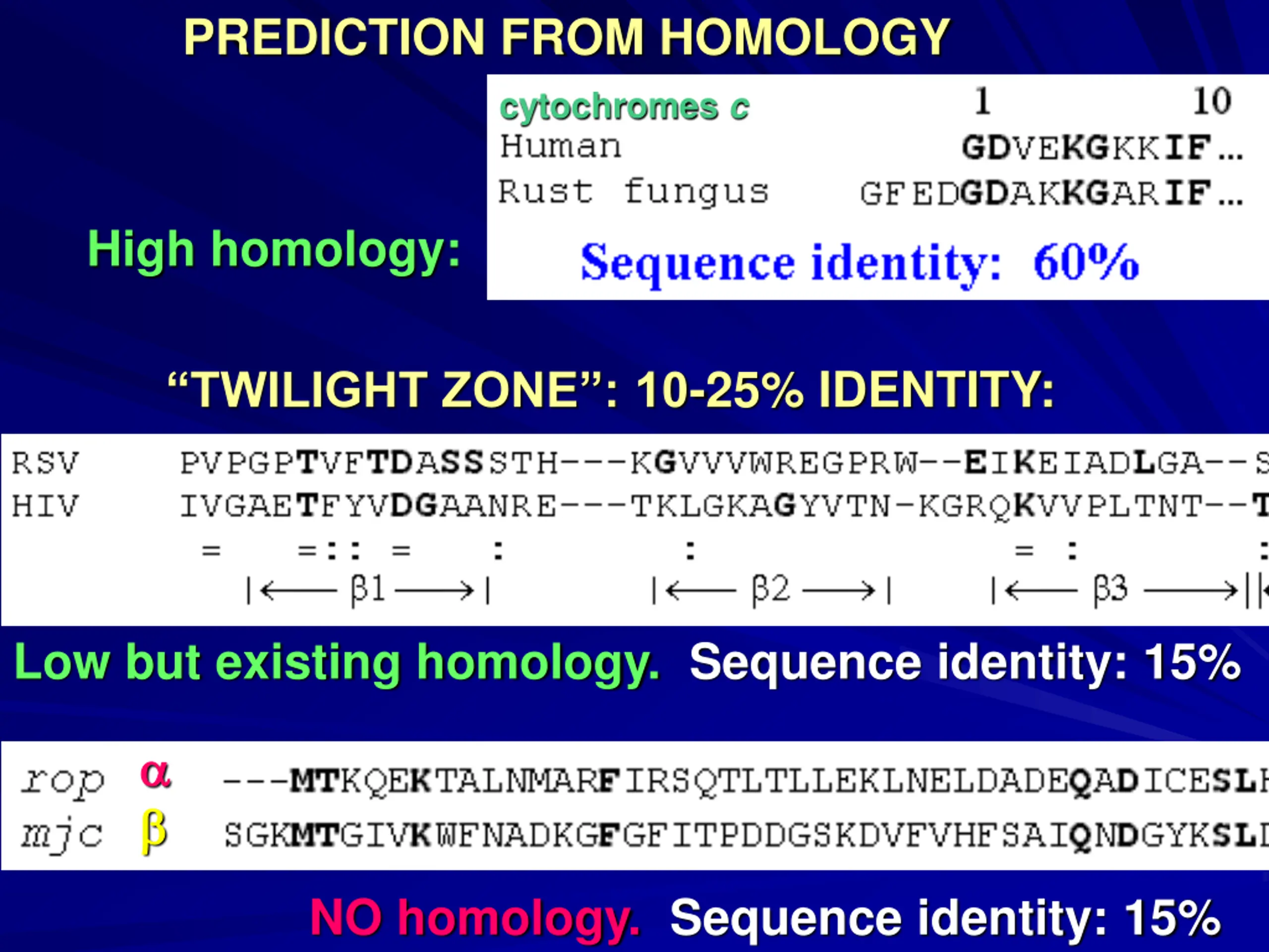 PREDICTION FROM HOMOLOGY cytochromes c High homology: TWILIGHT ZONE : 10-25% IDENTITY: Low but existing homology. Sequence identity: 15% NO homology. Sequence identity: 15%