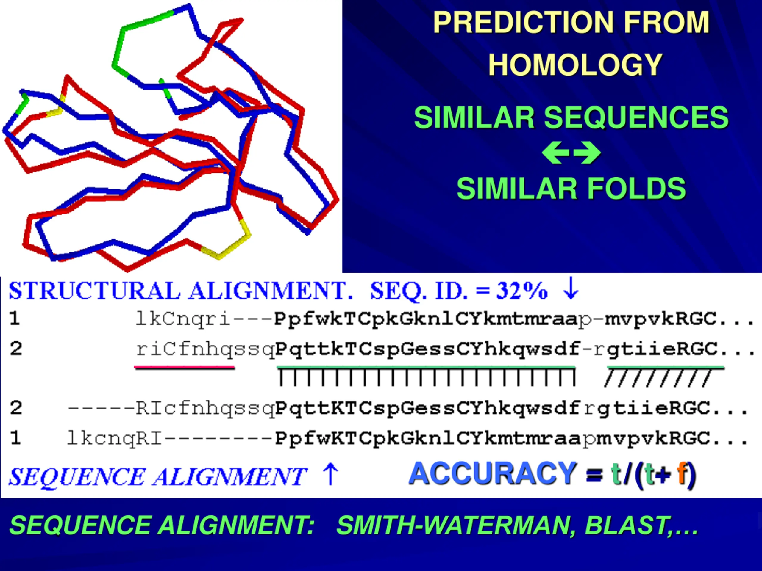 PREDICTION FROM HOMOLOGY SIMILAR SEQUENCES SIMILAR FOLDS ______ __________________ _______ ACCURACY = t/(t+f) SEQUENCE ALIGNMENT: SMITH-WATERMAN, BLAST,