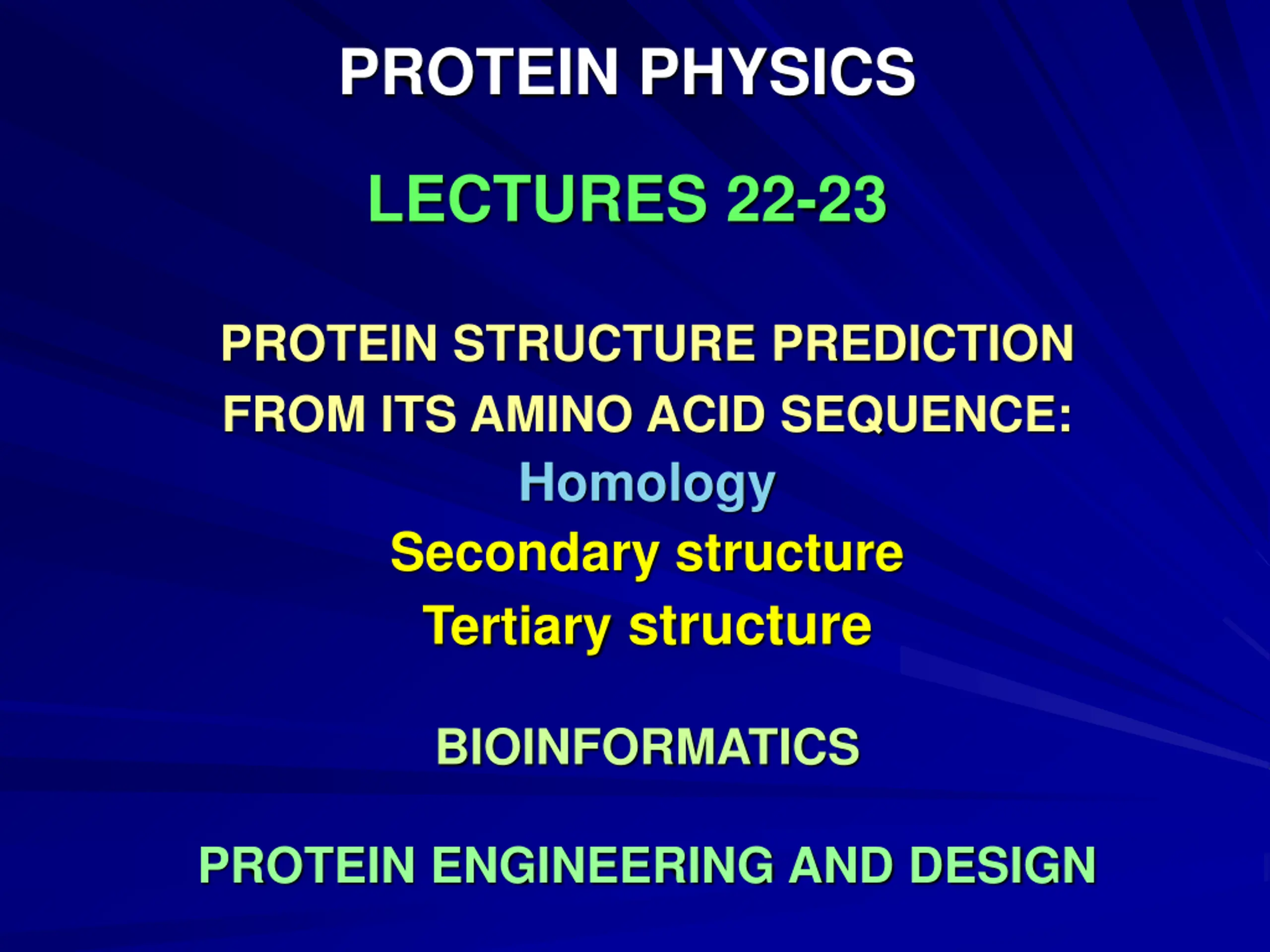 PROTEIN PHYSICS LECTURES 22-23 PROTEIN STRUCTURE PREDICTION FROM ITS AMINO ACID SEQUENCE: Homology Secondary structure Tertiary structure BIOINFORMATICS PROTEIN ENGINEERING AND DESIGN
