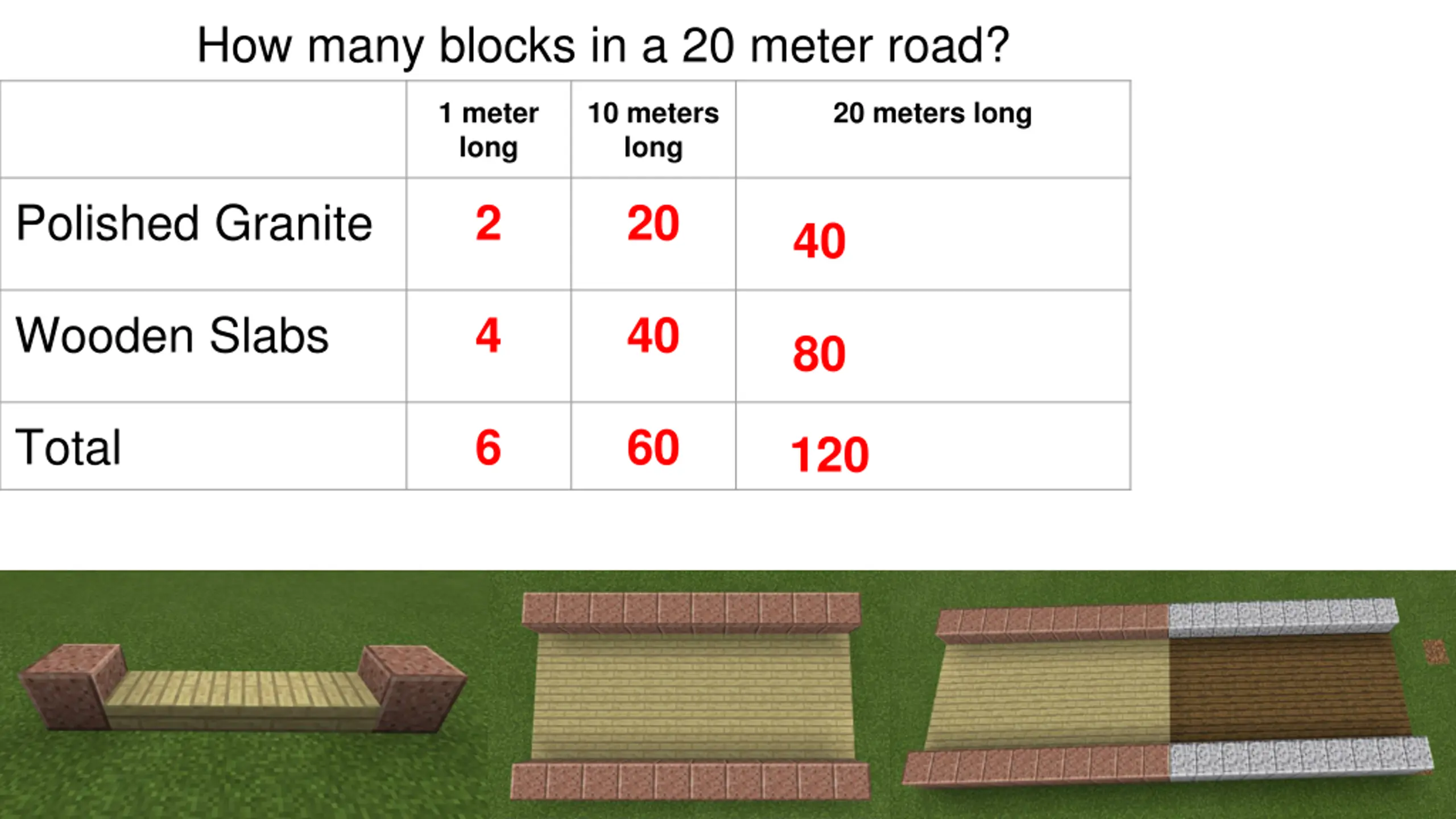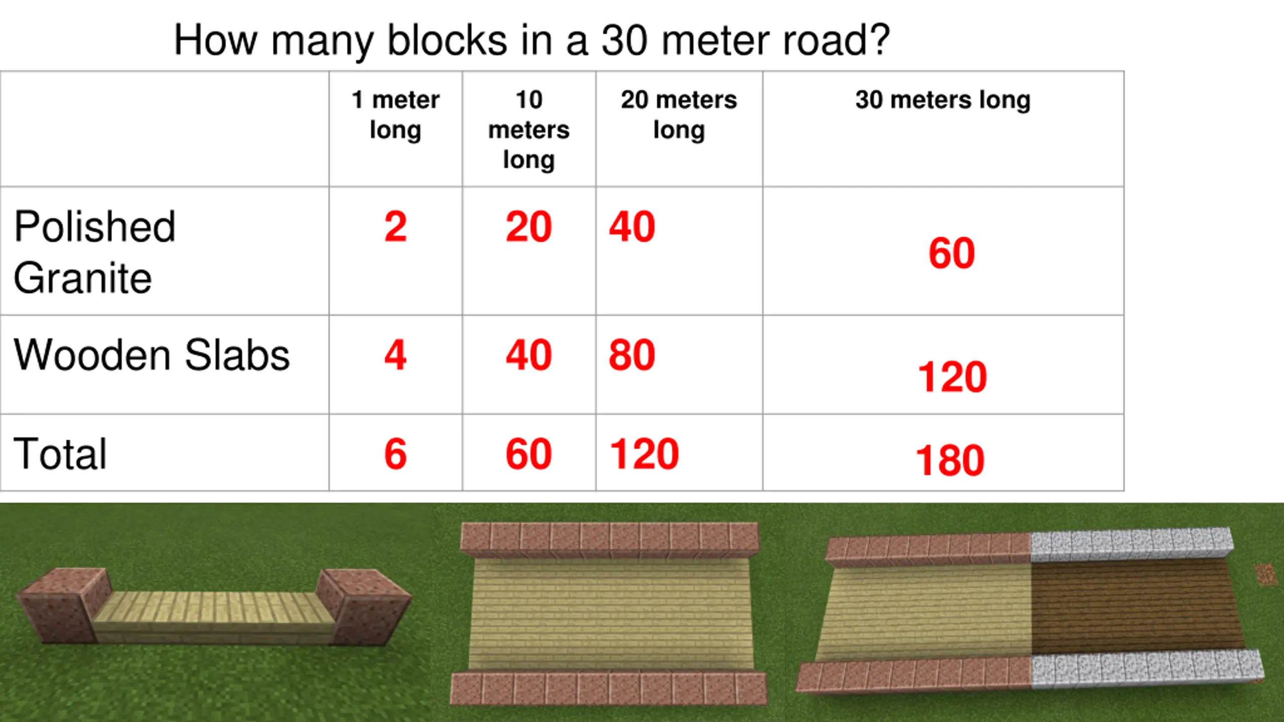 How many blocks in a 30 meter road? 1 meter long 10 20 meters long 30 meters long meters long Polished Granite 2 20 40 60 Wooden Slabs 4 40 80 120 Total 6 60 120 180