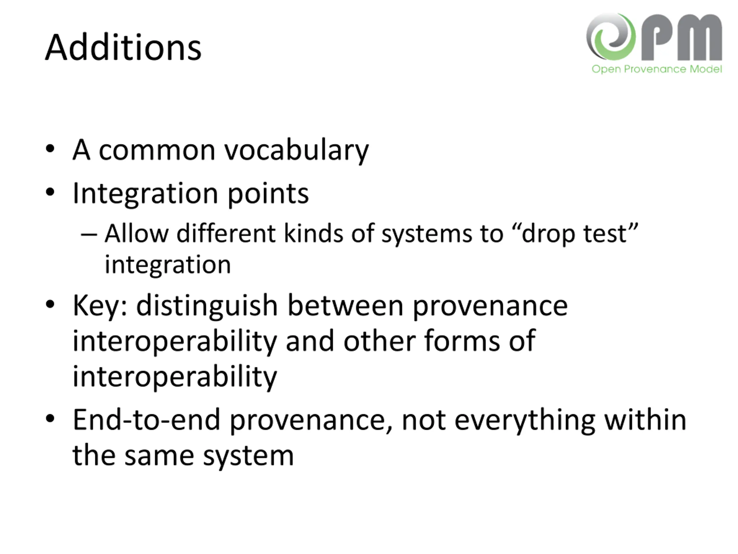 Additions A common vocabulary Integration points Allow different kinds of systems to drop test integration Key: distinguish between provenance interoperability and other forms of interoperability End-to-end provenance, not everything within the same system
