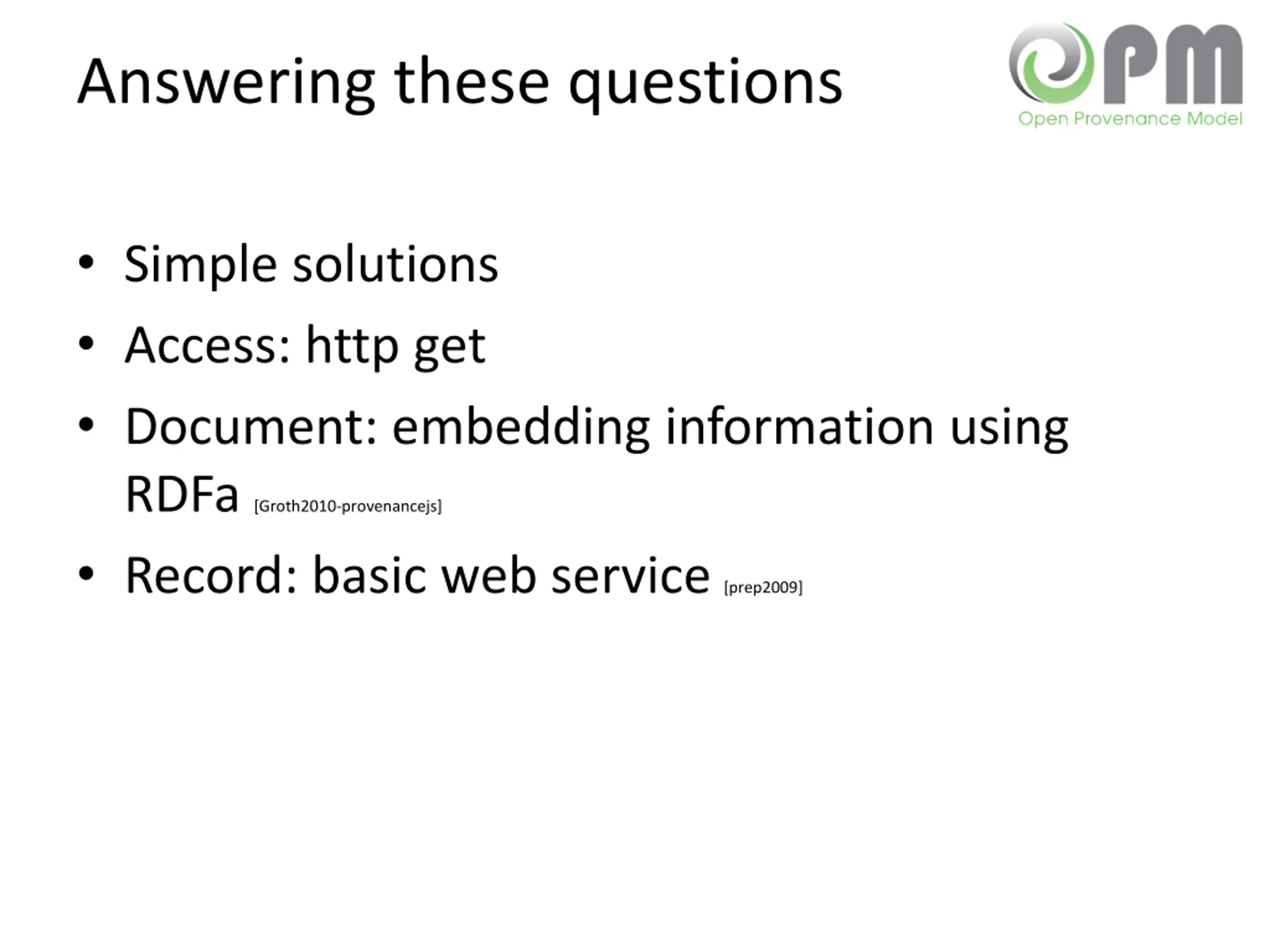 Answering these questions Simple solutions Access: http get Document: embedding information using RDFa [Groth2010-provenancejs] Record: basic web service [prep2009]