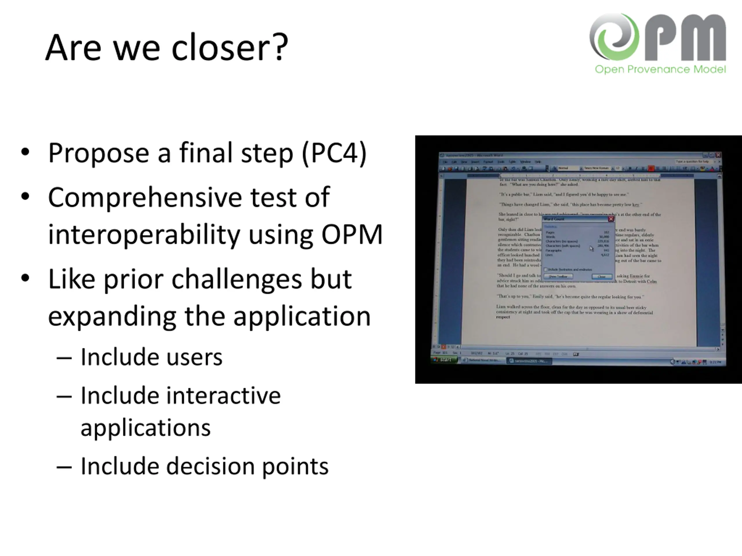 Are we closer? Propose a final step (PC4) Comprehensive test of interoperability using OPM Like prior challenges but expanding the application Include users Include interactive applications Include decision points
